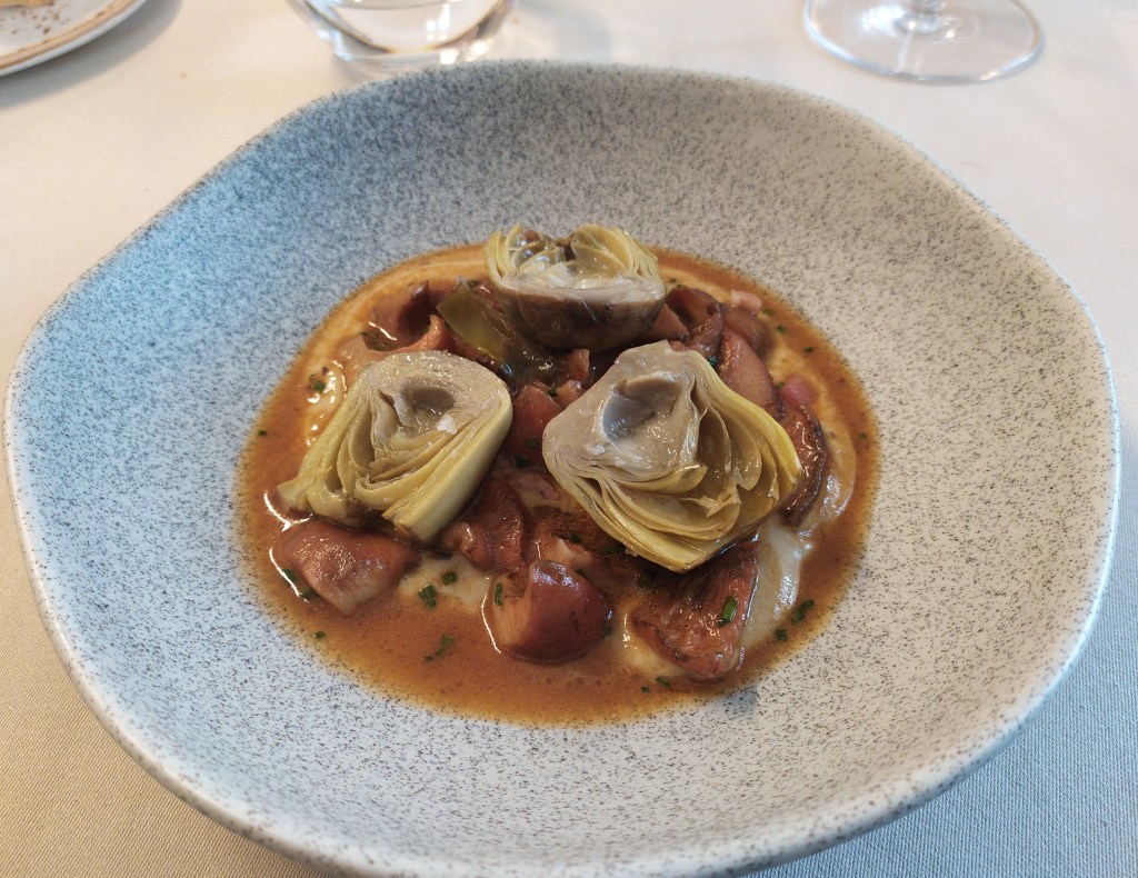 -Alcachofas sobre crema de alcachofas en un guiso de níscalos y bacon