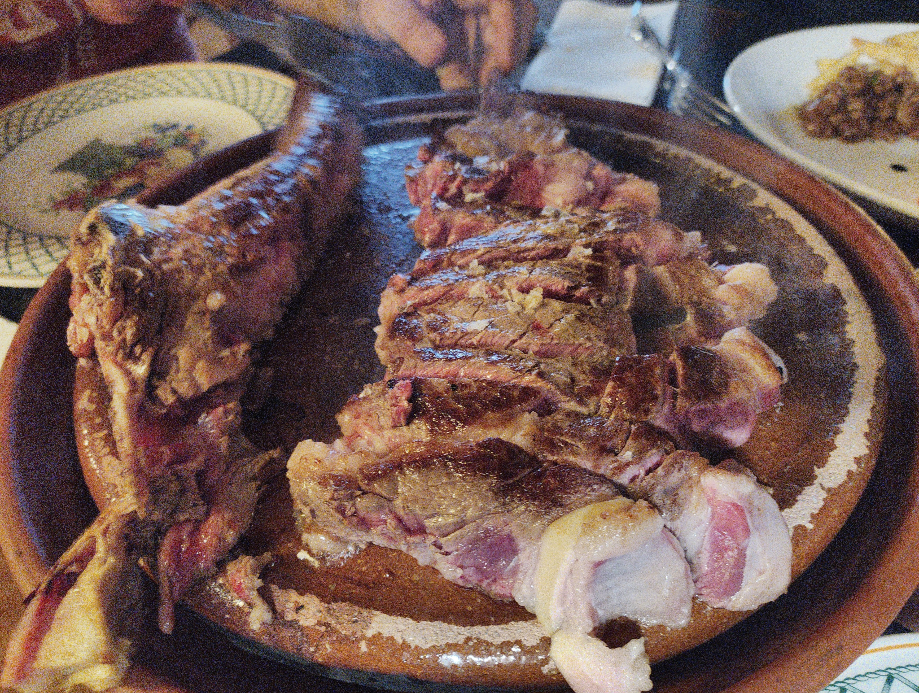 El primer comensal se pidió lo suyo y nos tocaba a los «bitten brothers» … una ración de croquetas, que como había de dos variedades, no nos quedó otra que pedir de las dos … hacía mucho tiempo que una croqueta no me sabia tanto a harina como en esta ocasión, a parte de a harina, no sabían ni a cecina ni a bacalao tal y como decía en la carta, para seguir, y sin perder la costumbre, un chuletón … palabras textuales al camarero/encargado » queremos un chuletón para nosotros, uno para los dos, de nuestro tamaño» … despues de reirse como un bobo le pregunto … lo has entendido??? respuesta » si si si, tranquilo» bien …. al cabo de un rato y despué de esa «magnifica» experiencia con las croquetas, aparece la camarera con un «chuletón» de un kilo escaso (que hacemos con eso) … acto seguido, llamada al encargado, después de mas o menos hacerle entender que no sabia lo que hacía nos pusimos a comer.