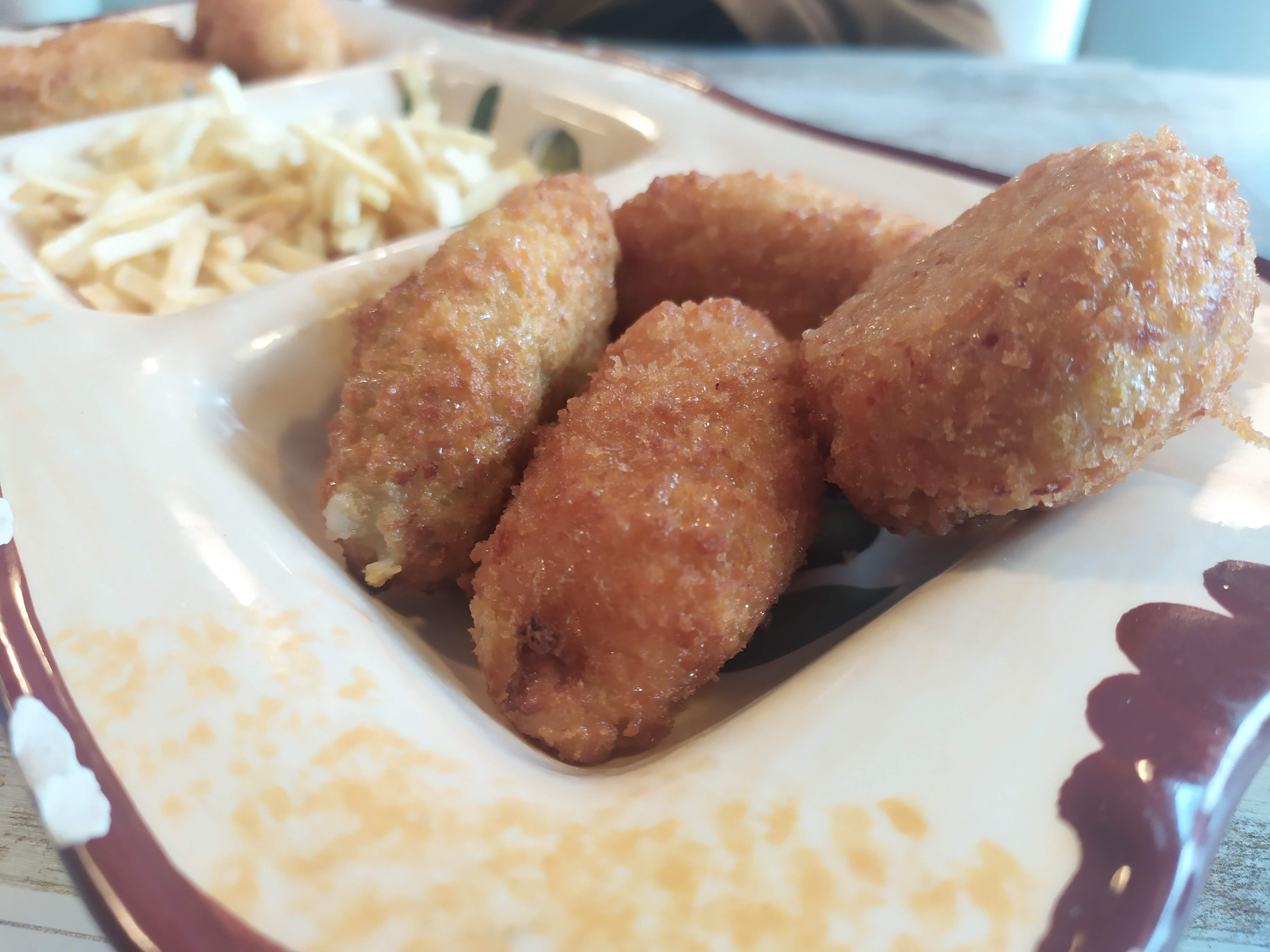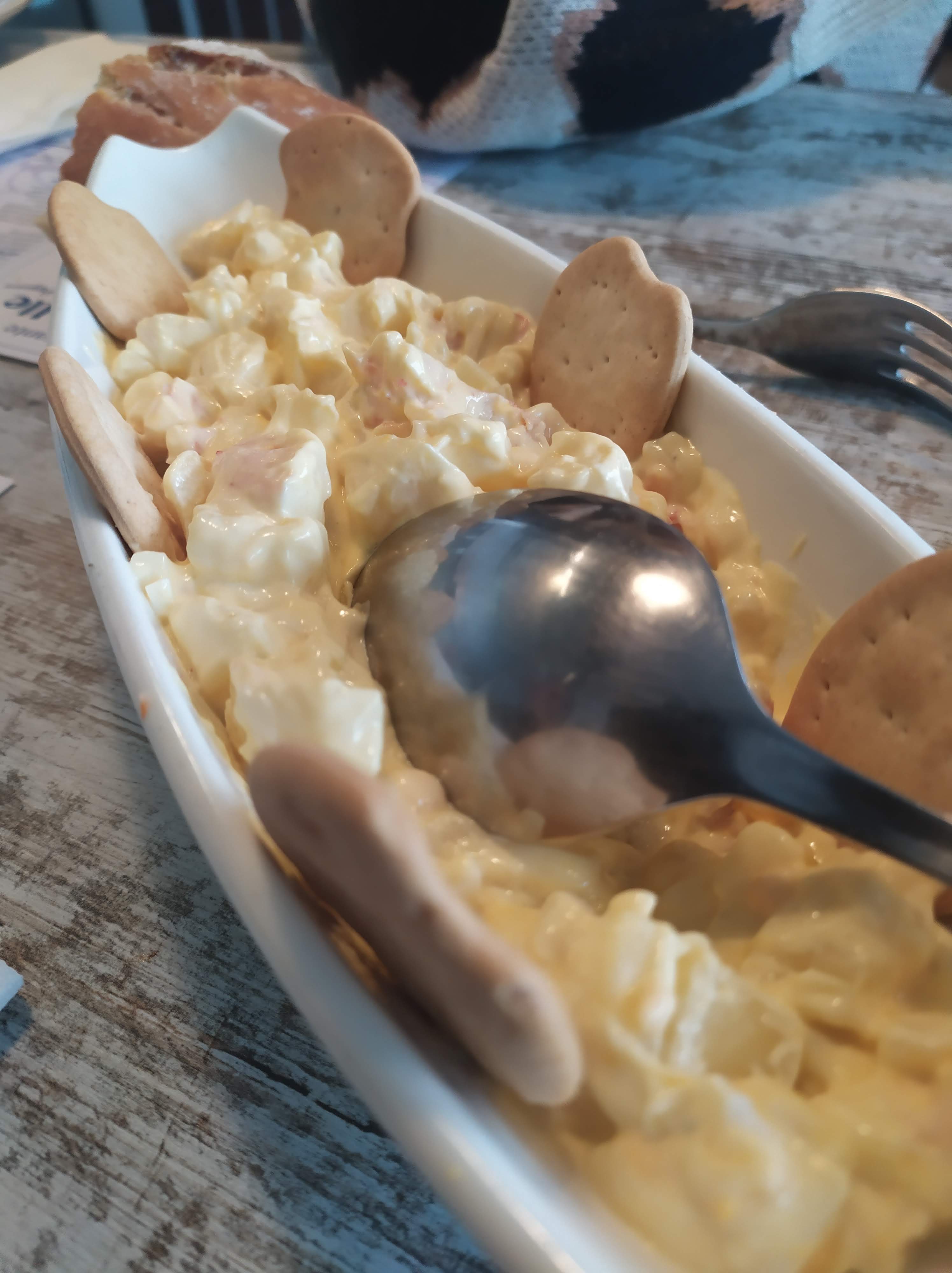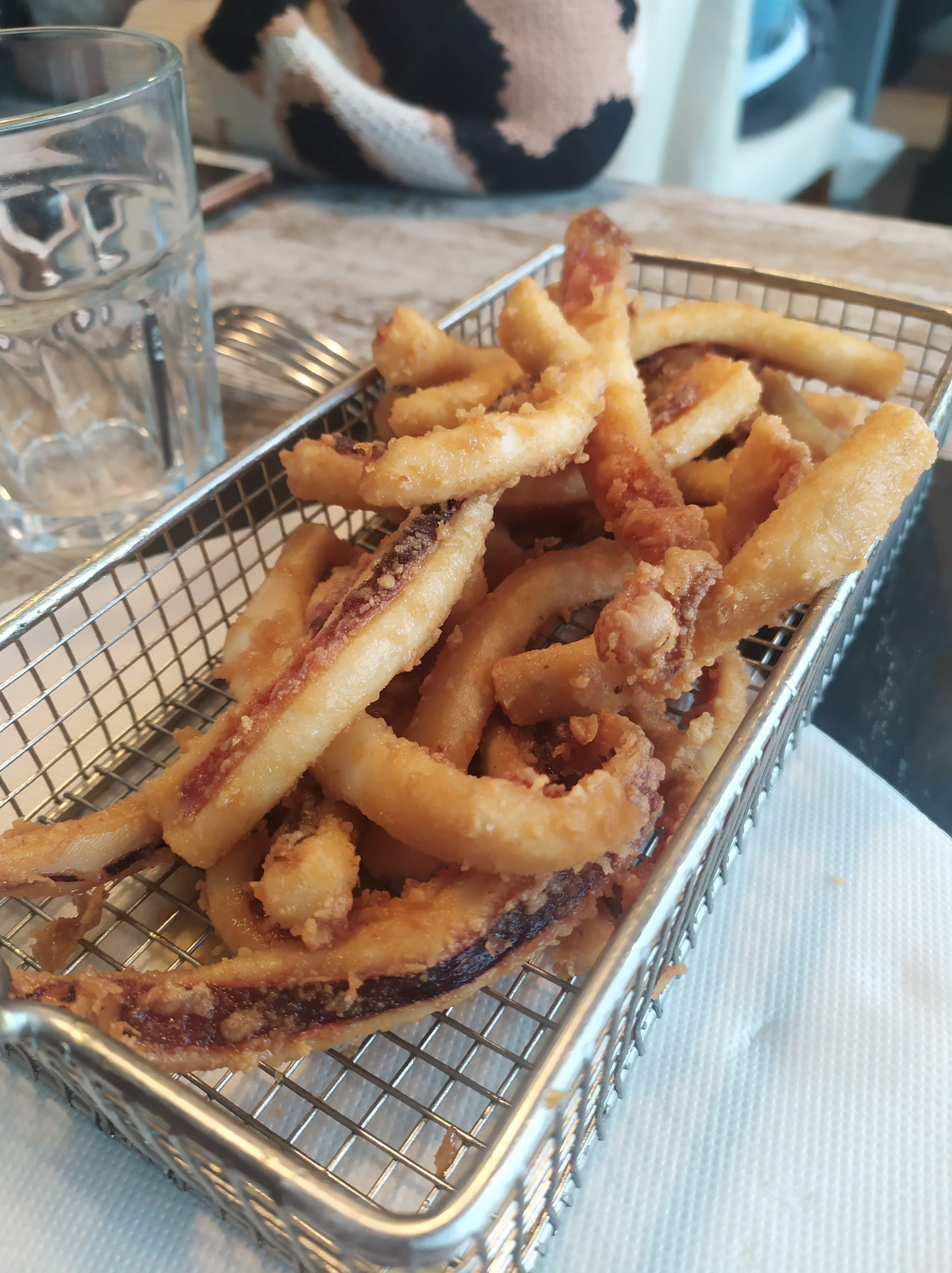 Disfrutamos de unas magnificas rabas, suaves y sabrosas croquetas, la famosa ensaladilla de langostinos, arroz con «bichos» y un par de chuletas de 1kg cada una, con patatas y huevos, todo ello regado con un buen Pepe Yllera.