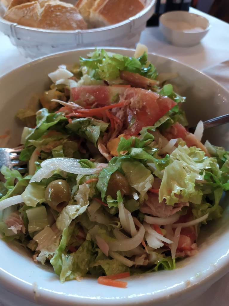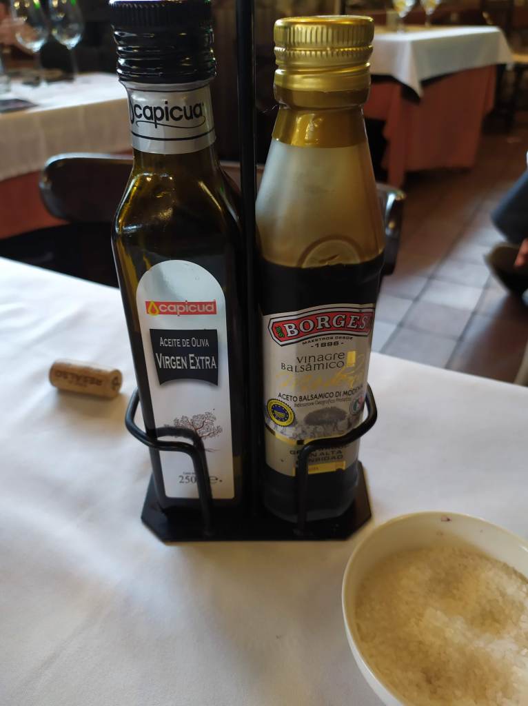 La comanda fue, una ensalada mixta para compartir y dos chuletones de vaca vieja. Dimos por hecho que el paisano que nos atendió, se enteré que la ensalada no era el primer plato, pues no, fallo nuestro también por no contar con ese despiste … Bueno, pues tardaron otros 15 minutos en traer la ensalada … Nos traen la ensalada y nosotros esperando al chuletón mientras charlamos y tomamos una copa de vino … Por cierto, la ensalada ya venía aliñada con vinagre de jerez … El accesorio de aceite/vinagre, venia con vinagre de modena, todo muy correcto.