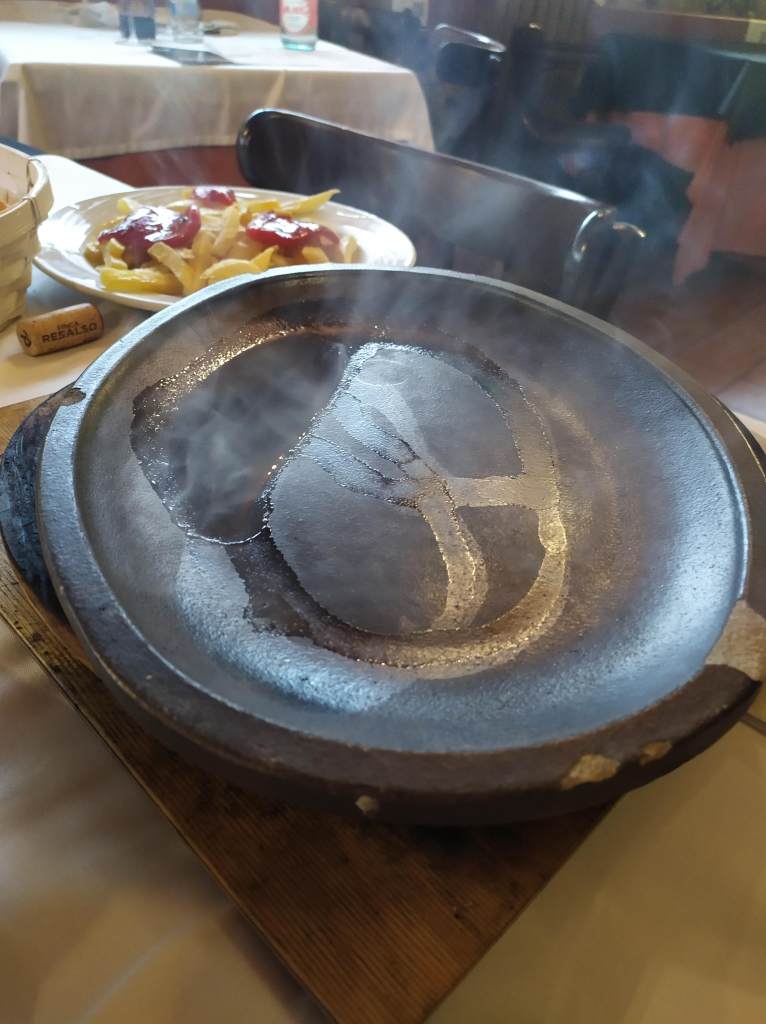 Después de pedir las chuletas, al cabo de un rato, ya ni lo miré … Ahí aparece con unas chuletas de 600/800 gramos, que ya de por si, tenían pinta de haberlas hecho muy rápido, y con una piedra humeante, a la cual no se le ocurre otra cosa, que echar aceite de oliva por encima … Todo el comedor lleno de humo.