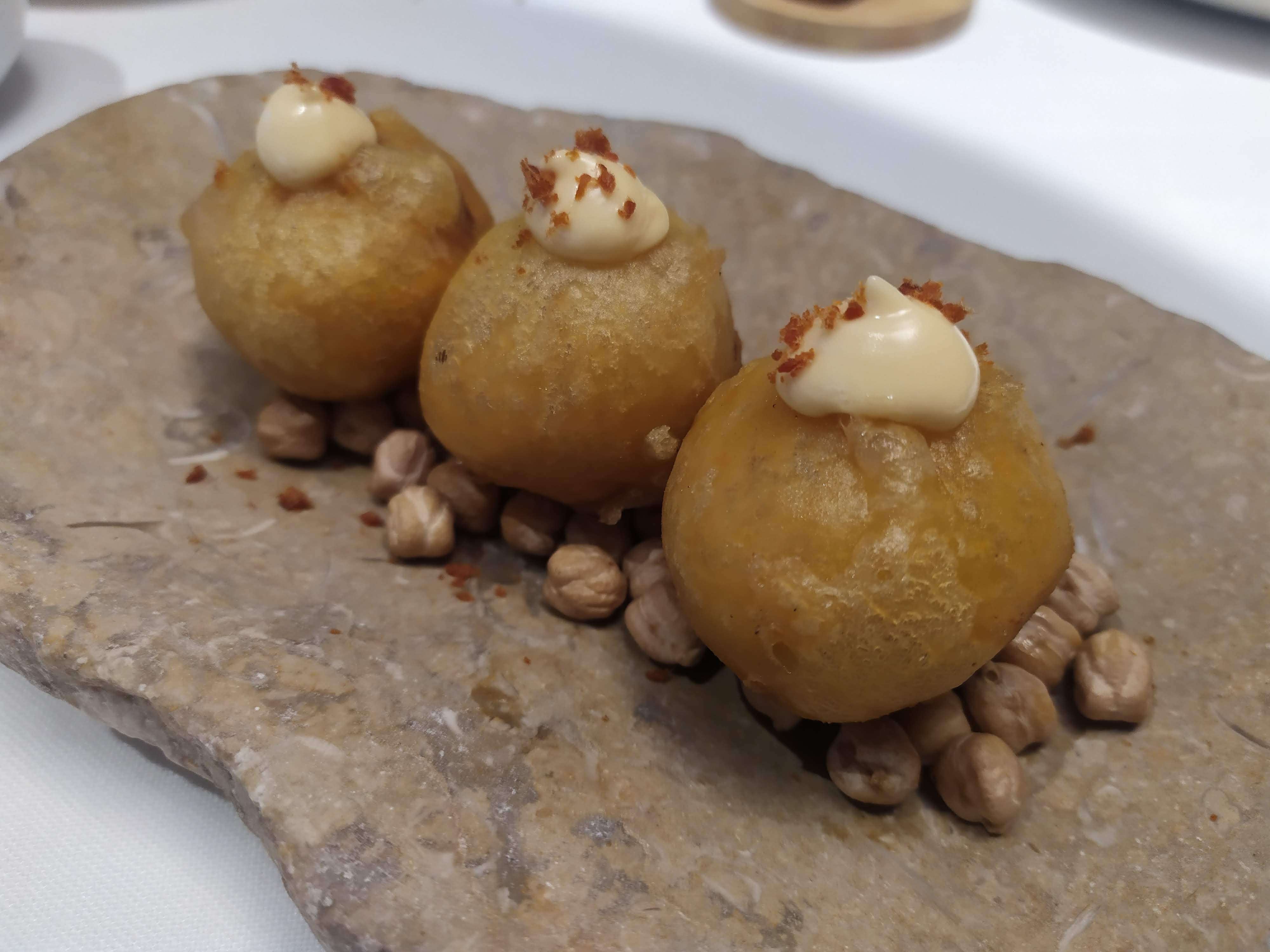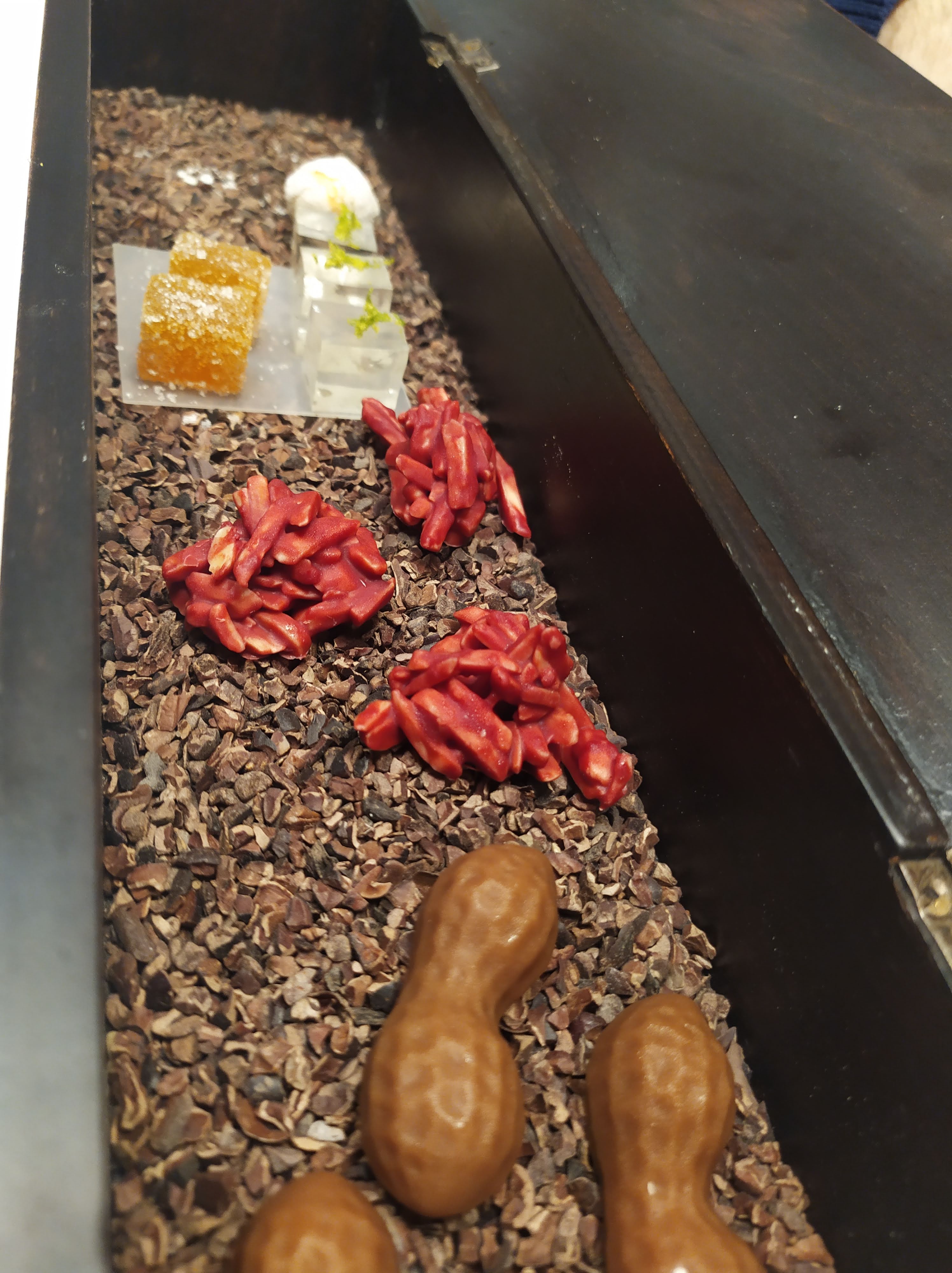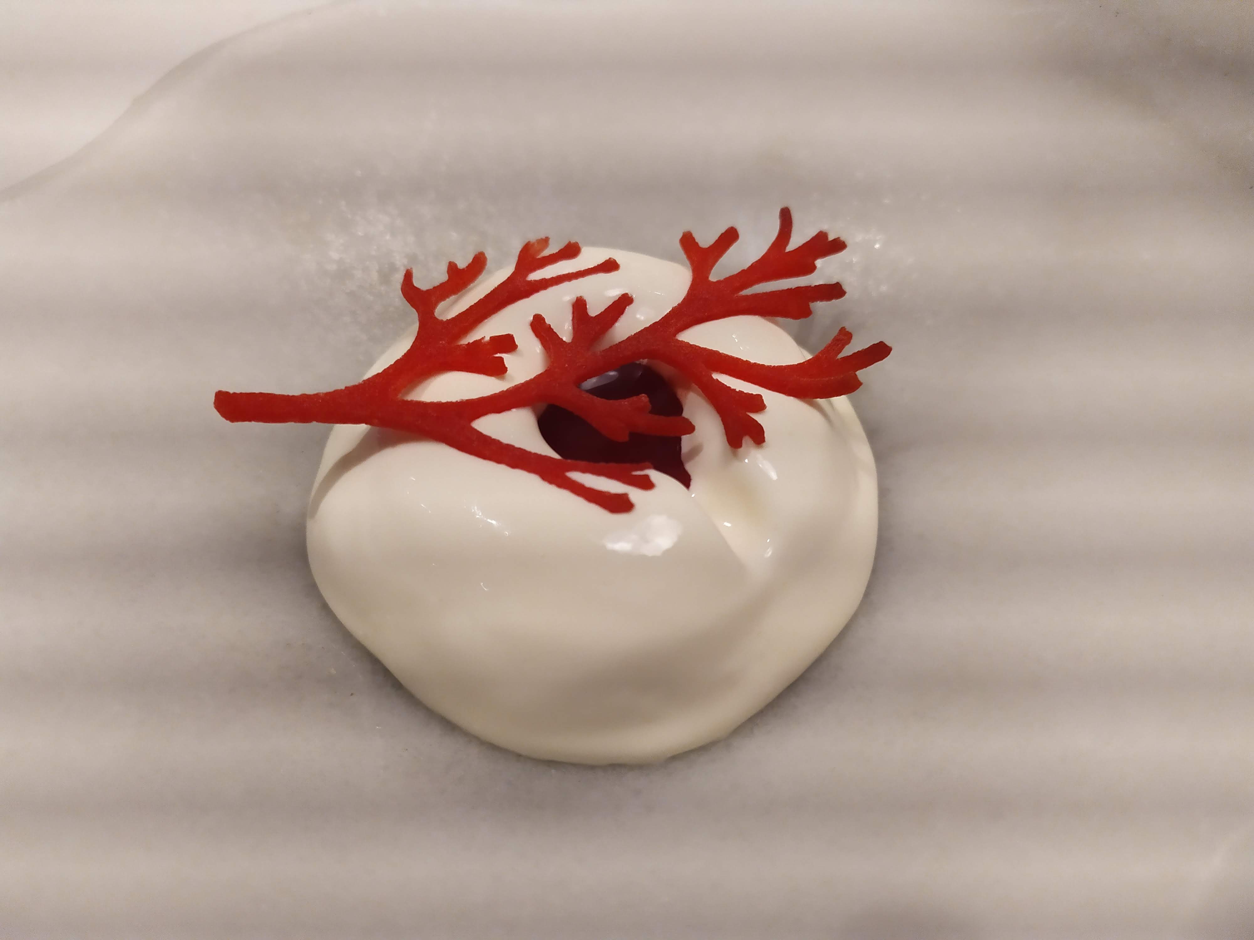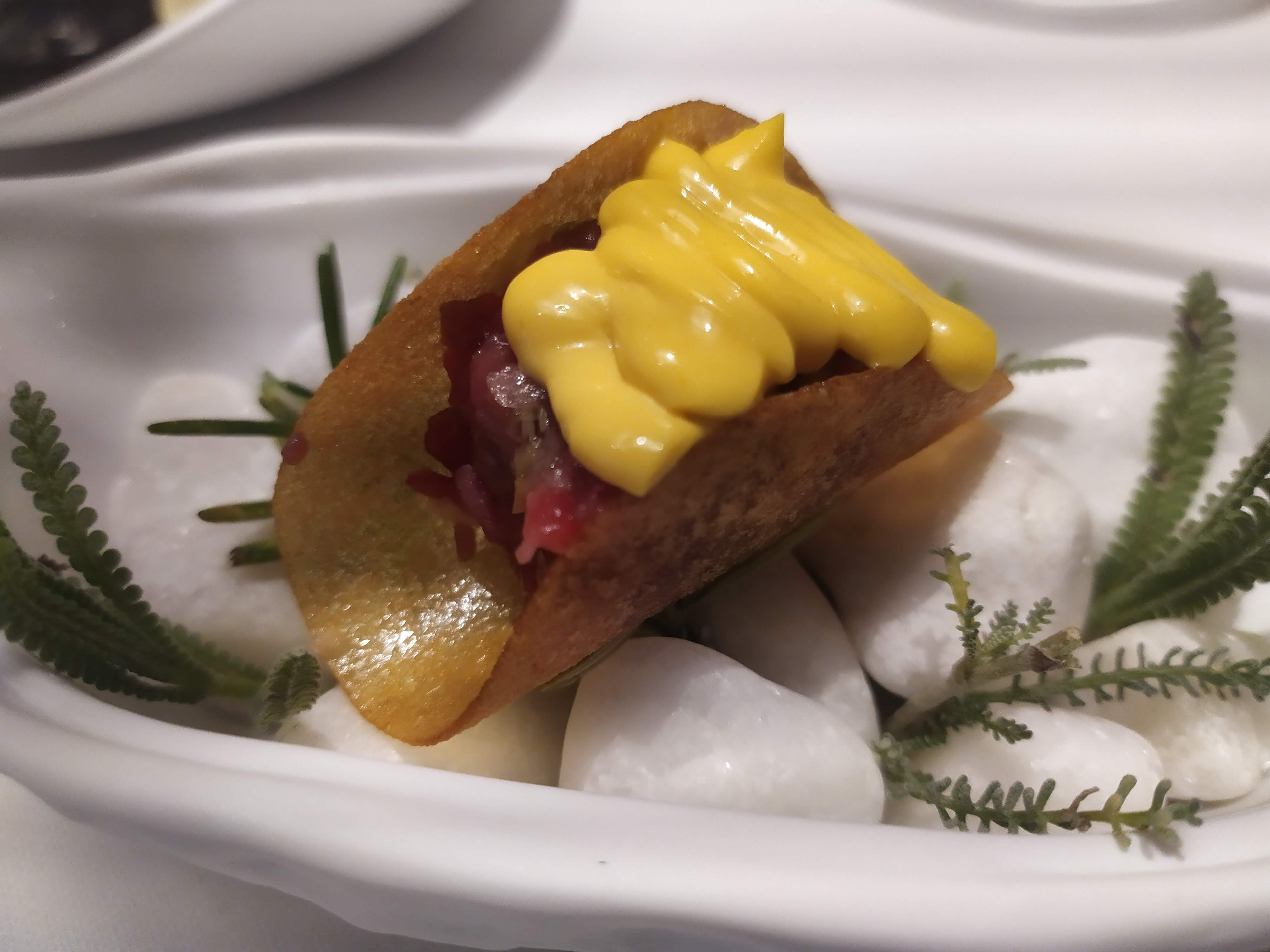 — El tomate de Ampuero de un bocado, ninguno de los tres comensales le sacamos el gusto que quizás el chef querría, para mi era agua de tomate metida en «un disco de hockey» que supongo estaba hecho de tomate, nos faltó un empuje, un sabor un poco más a solo agua de tomate. Pero en 18 platos no pueden gustar todos 😀
