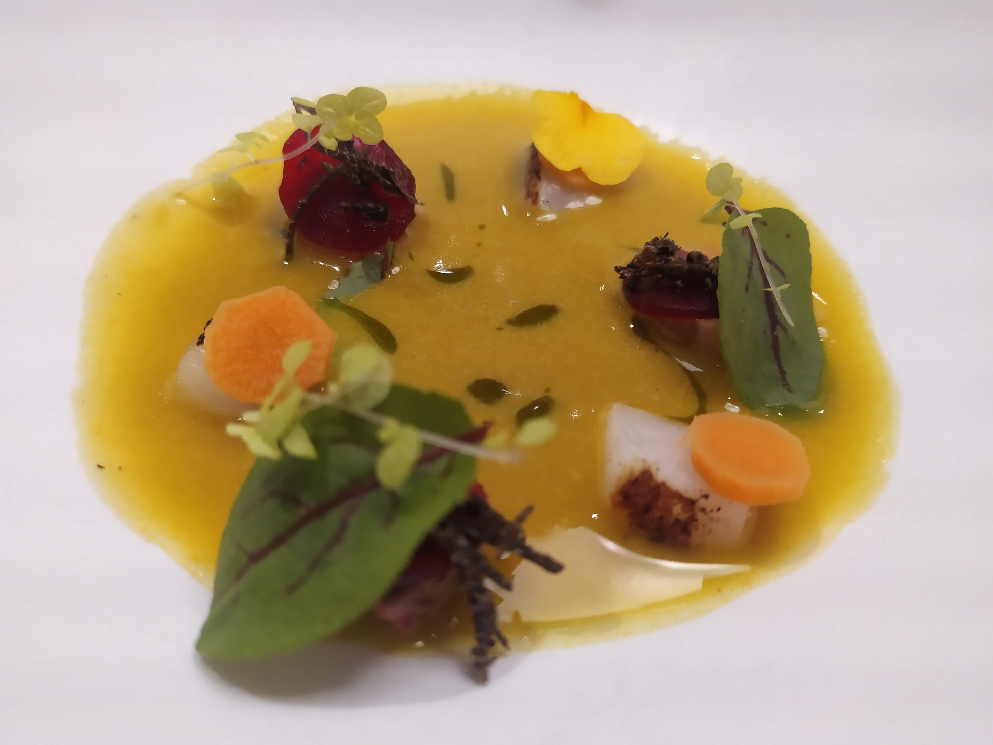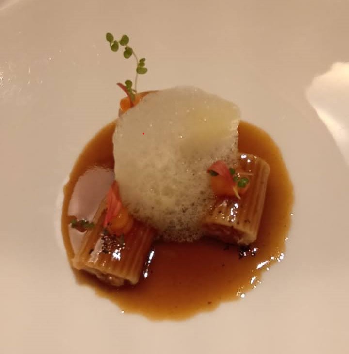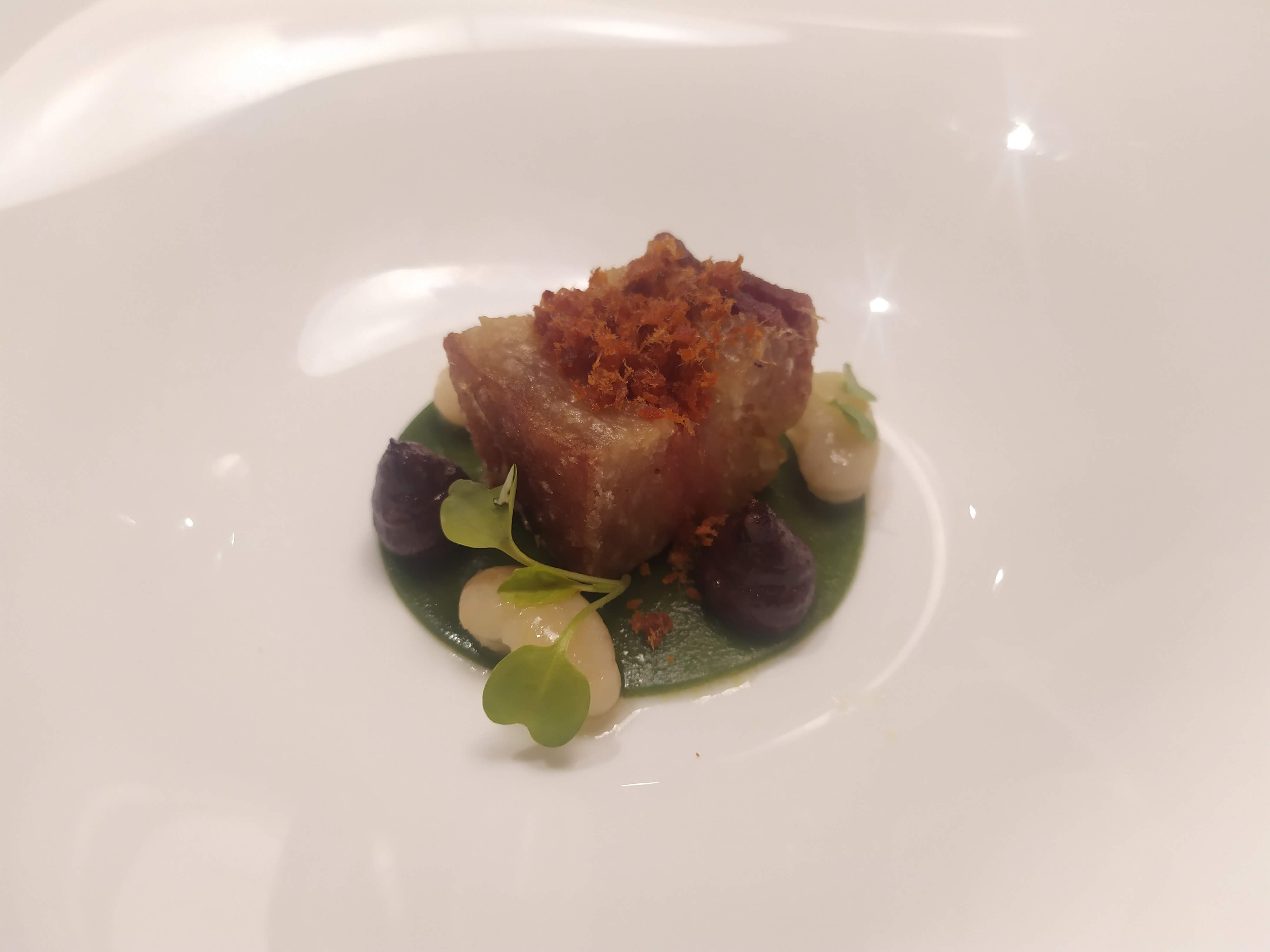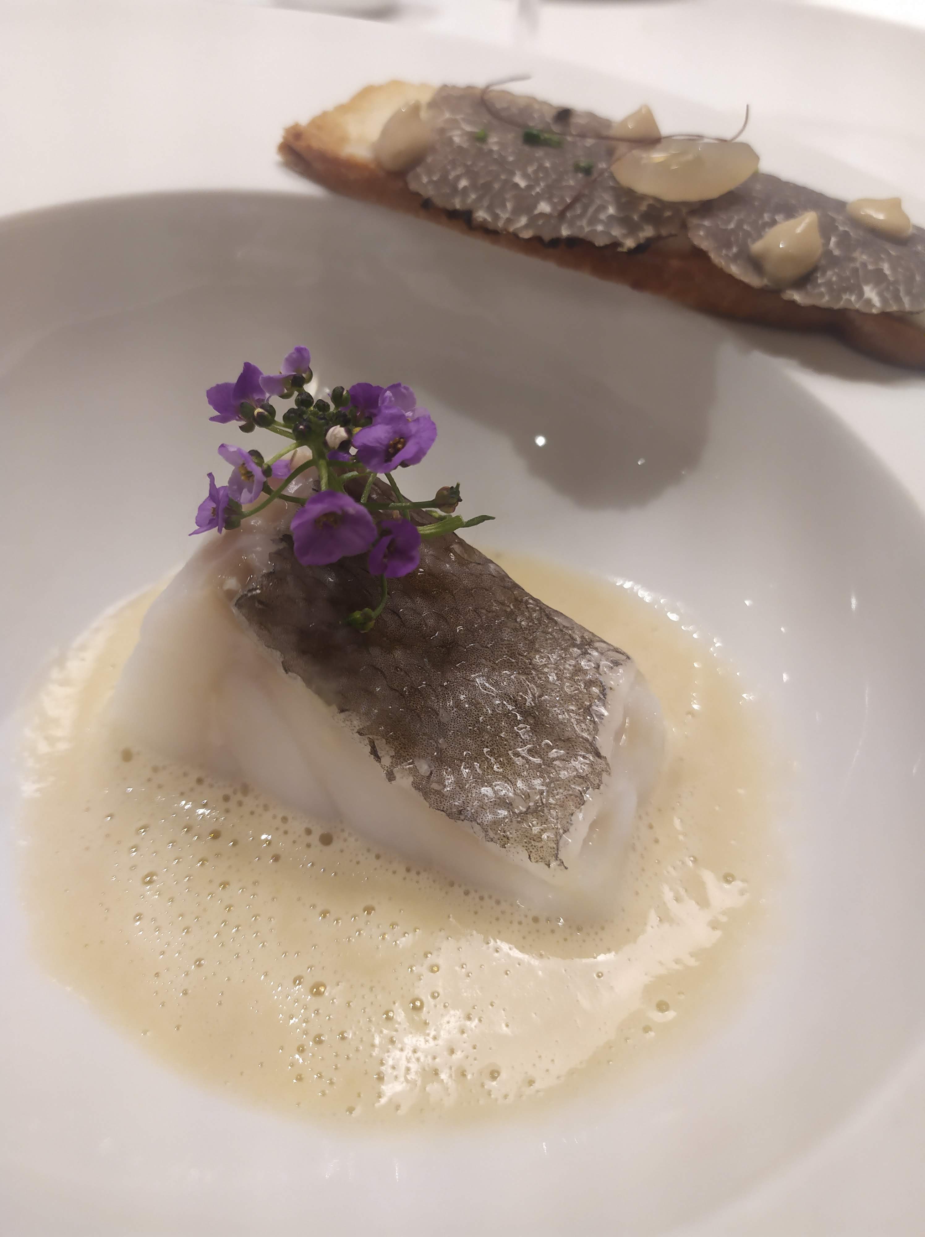 — El tomate de Ampuero de un bocado, ninguno de los tres comensales le sacamos el gusto que quizás el chef querría, para mi era agua de tomate metida en «un disco de hockey» que supongo estaba hecho de tomate, nos faltó un empuje, un sabor un poco más a solo agua de tomate. Pero en 18 platos no pueden gustar todos 😀