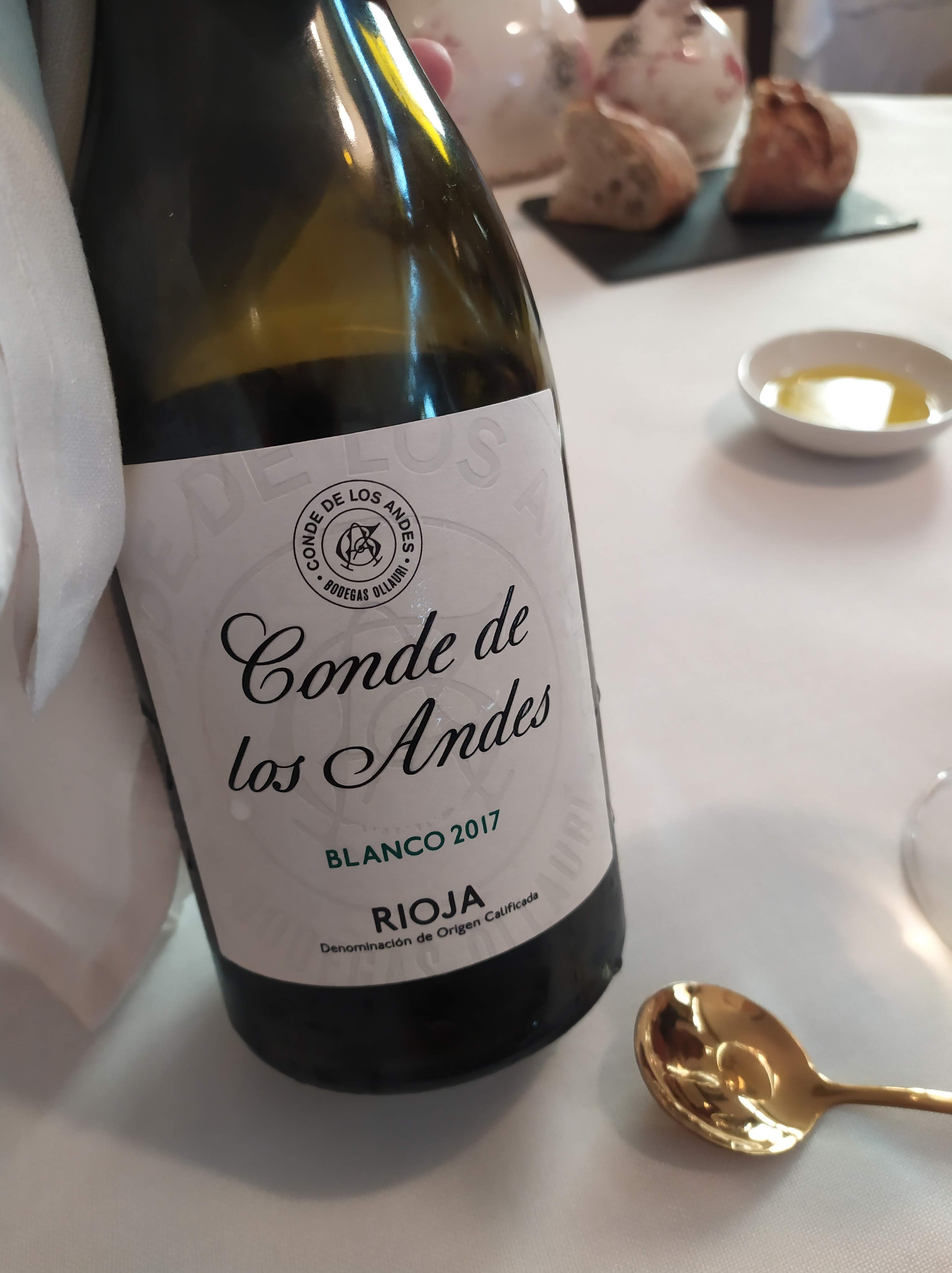 Empezamos con una gran vino blanco Rioja, Conde de los Andes, un poco afrutado, no muy seco y con un gran retrogusto.