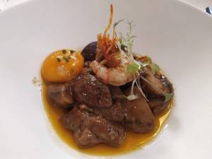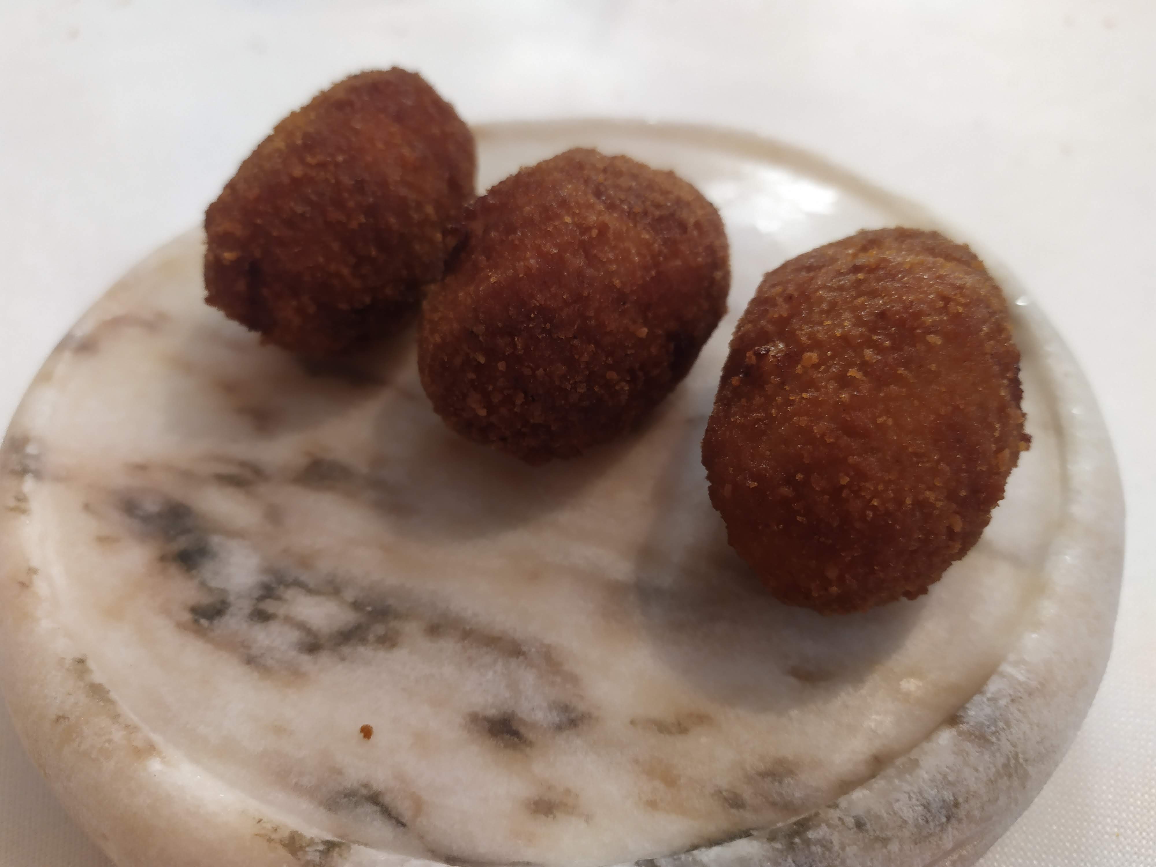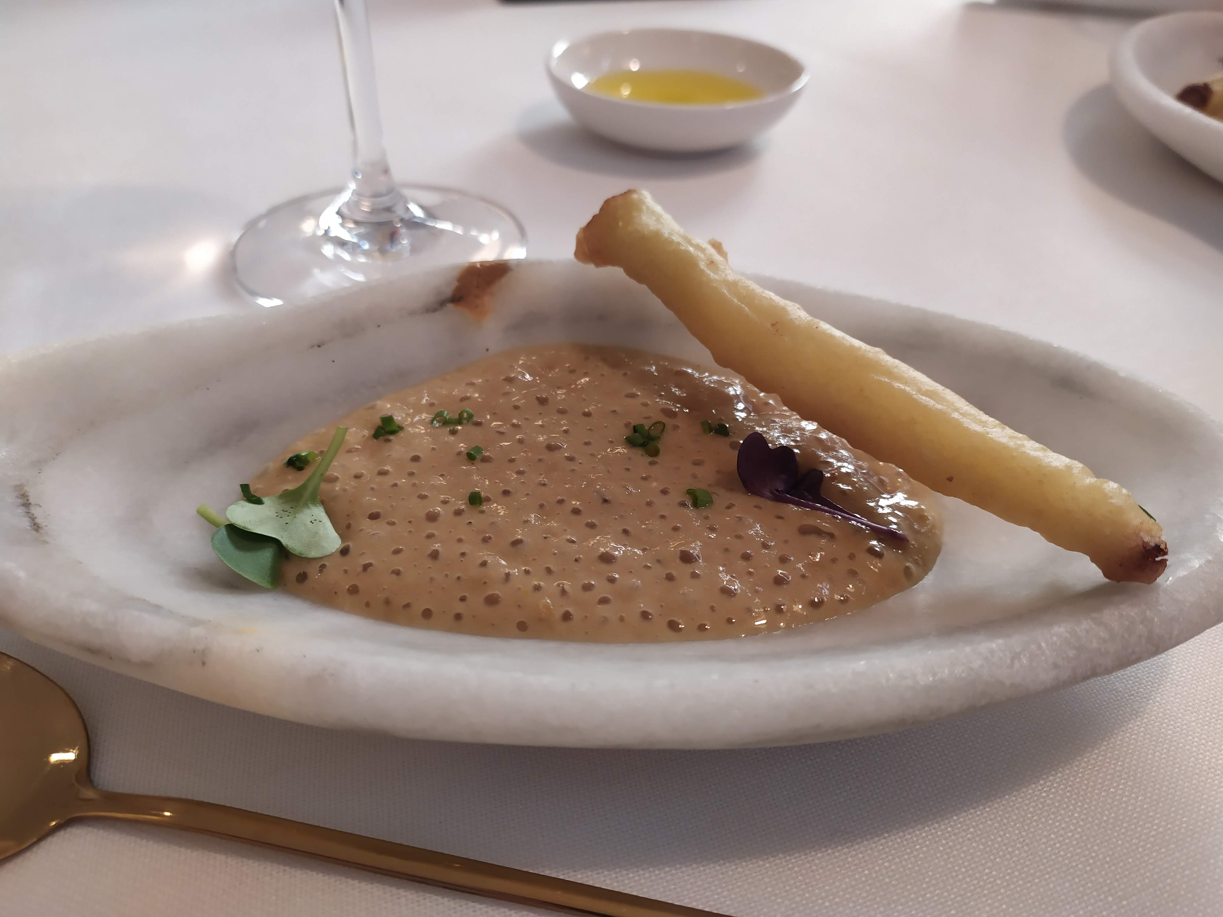 Crema de lentejas con «no me acuerdo» :), sopa de algas con percebes y almejas, flor de alcachofa con angulas, setas shiitake con langostino y yema de huevo, y las famosas croquetas de pitu caleya. En este último punto coincidimos mi compañero y yo, estaban muy buenas, por eso son campeonas, pero estaban mejor la vez anterior.