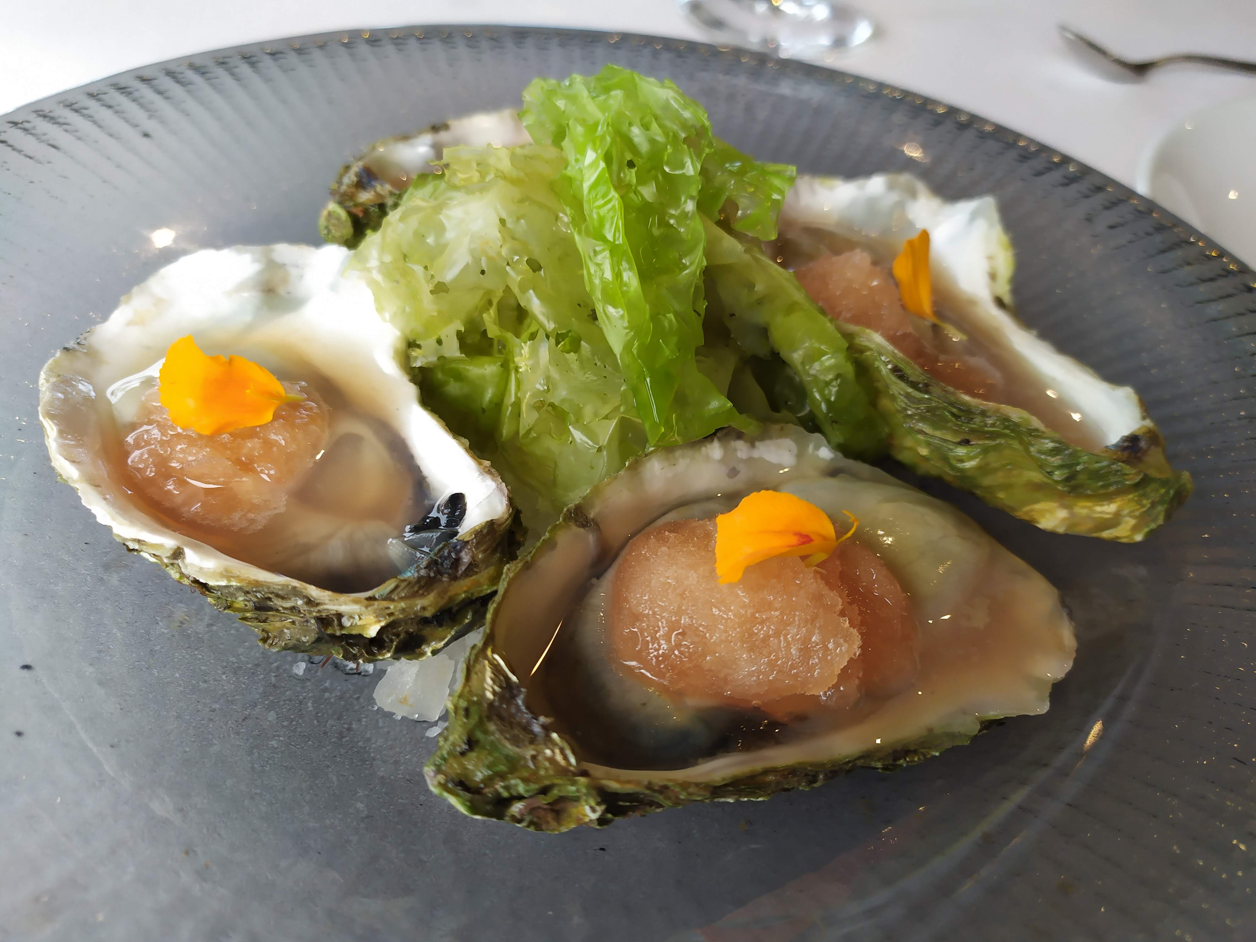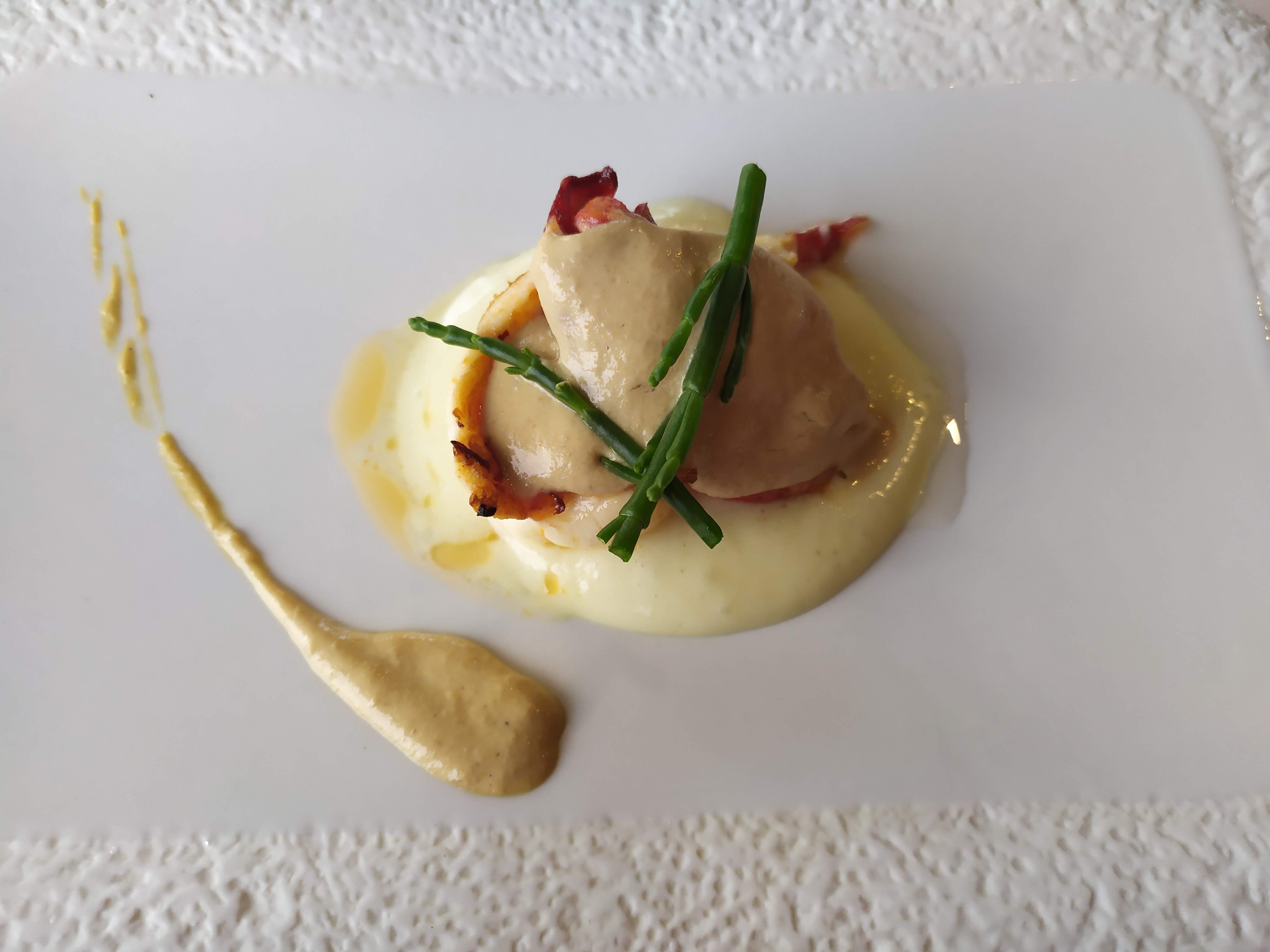 Para empezar pedimos unas ostras francesas con granizado de pomelo, un poco de caviar de Beluga y bogavante asado con parmentier y carbonara de setas, todo ello acompañado con un buen vino blanco.