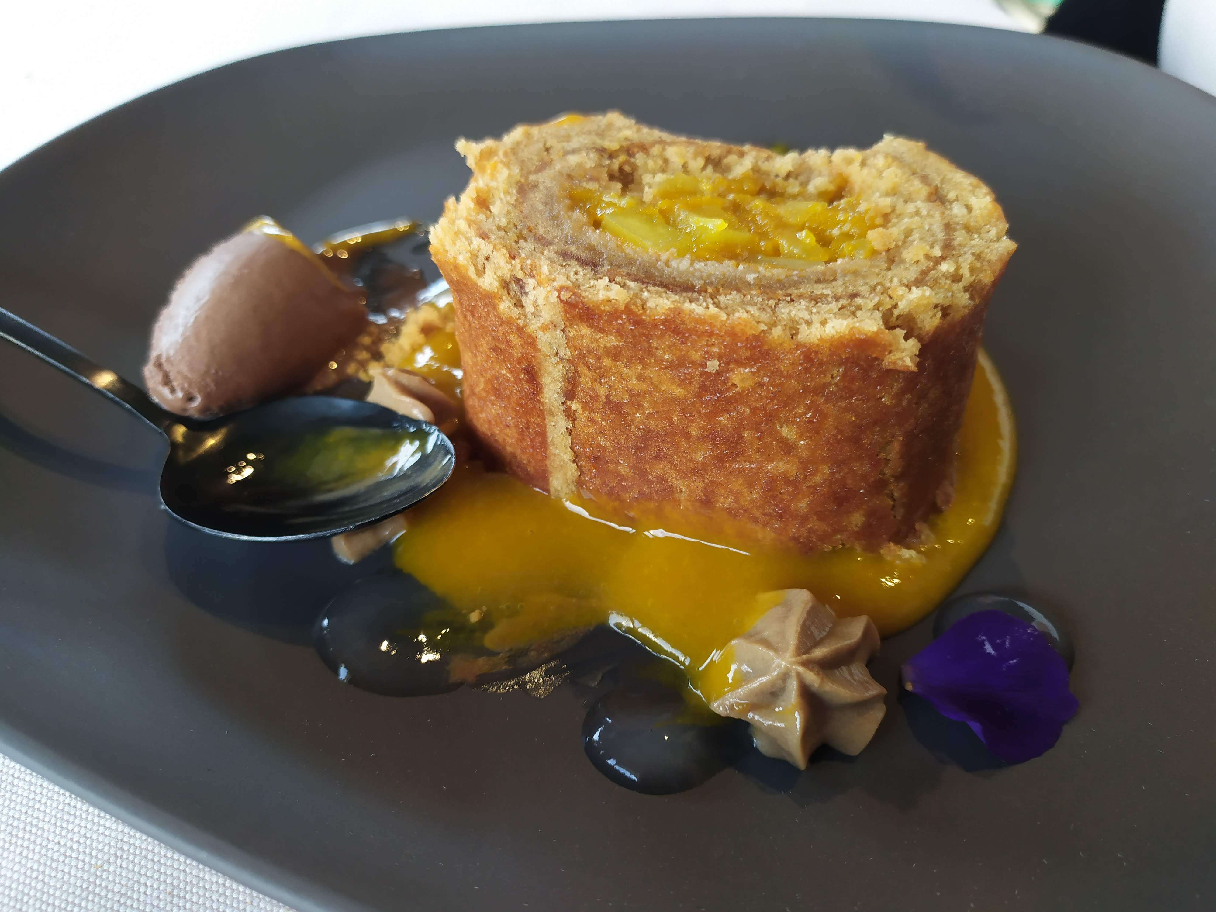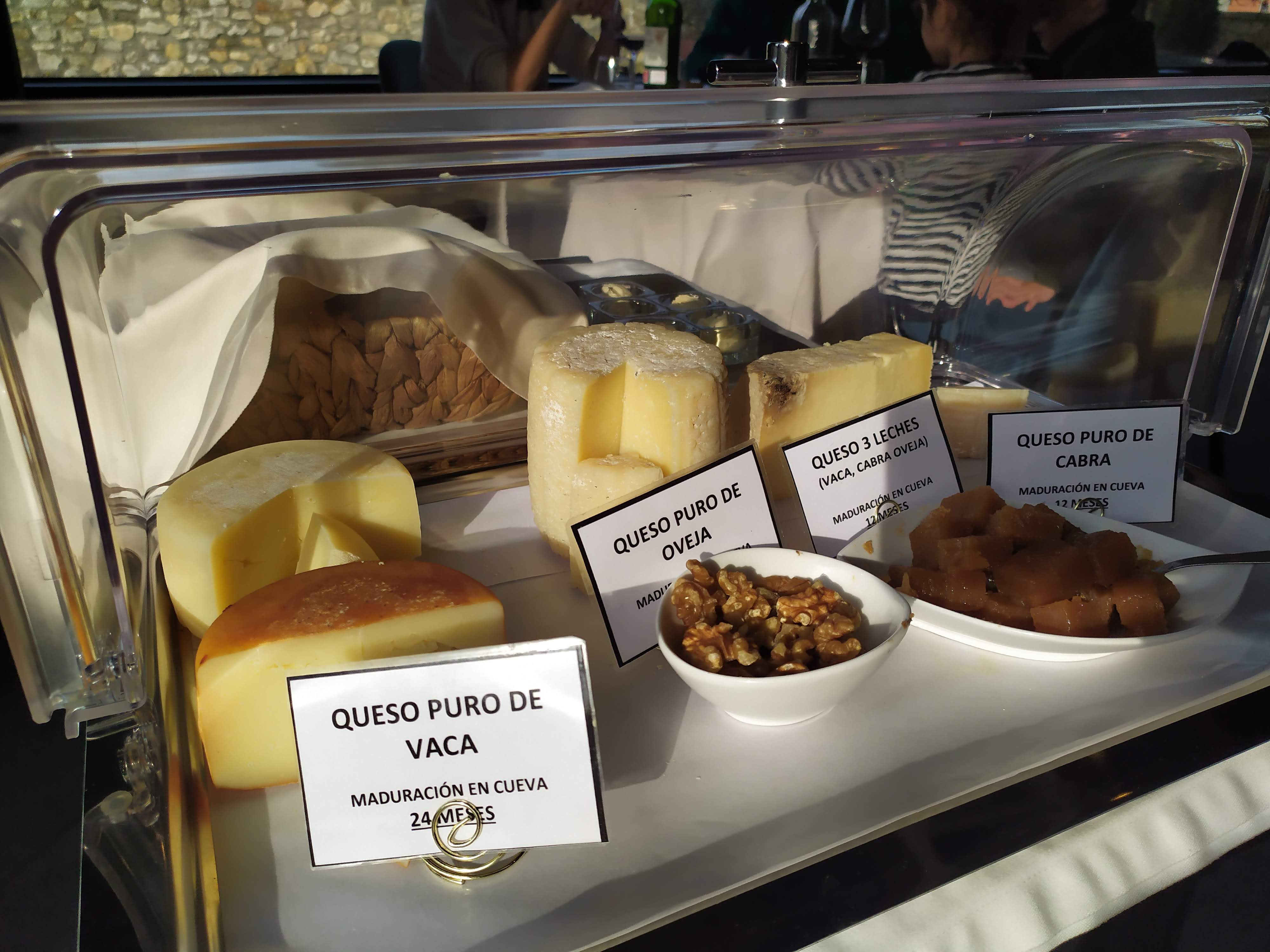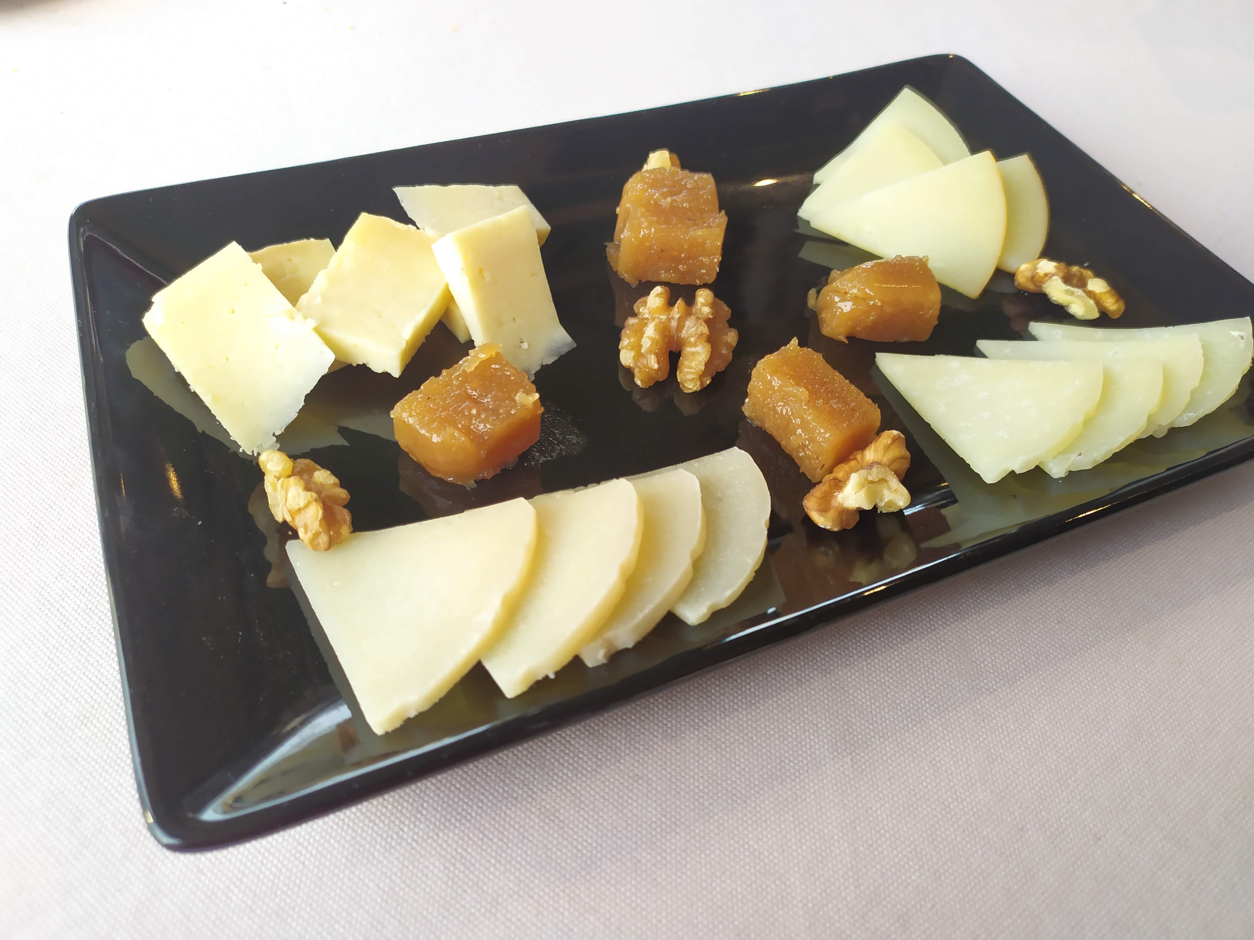 Esponjoso de Mango, Crema de Fresa y Gel de café para mi mujer y una pequeña tabla de quesos de producción cántabra (de Torrelavega, según el camarero, no me quiso decir el nombre del productor) para mí.