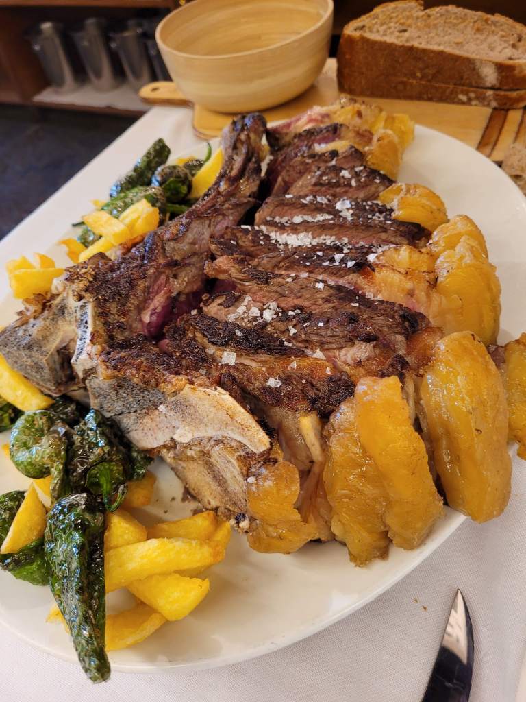 Lo peor de todo para mí, fue el chuletón, en la carta pone «vaca madurada», preguntas cuento tiempo y te dicen 20/25 días, perdoname, pero eso no es madurado, eso es lo normal. Bueno, quitando ese detalle … Le pedimos de 1.5kg, para dos personas, a ver … Cortaron uno de 6cm de grosor para que llegase al peso, el resultado … No muy bueno, no puedes dar un chuletón de esas dimensiones si no sabes hacerlo, como somos carnívoros, nos lo comimos y punto, pero vamos, mejorable al 100%.