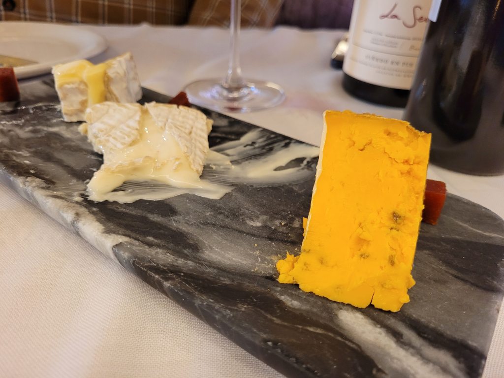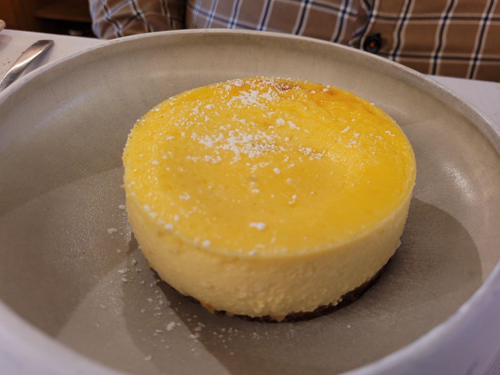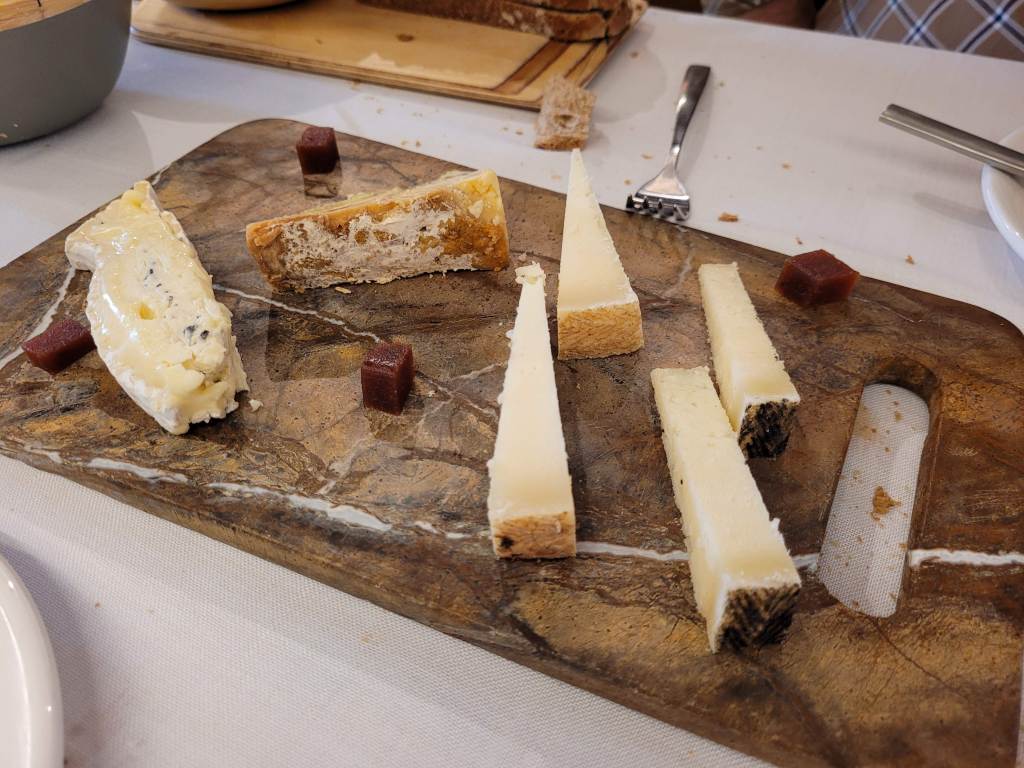 -Y para rematar la faena, una tabla de quesos y un par de postres, Tarta de queso horneada, bastante buena, y tarta «fea», un postre extraño que no me gustó demasiado.