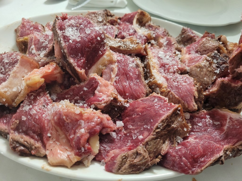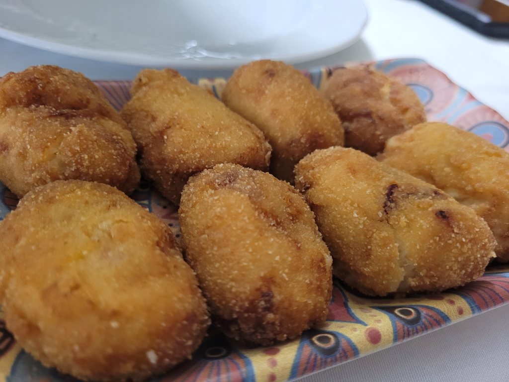 Croquetas cremosas de jamón y chuletón de vaca vieja con su piedra para poder comerlo al gusto de cada uno.