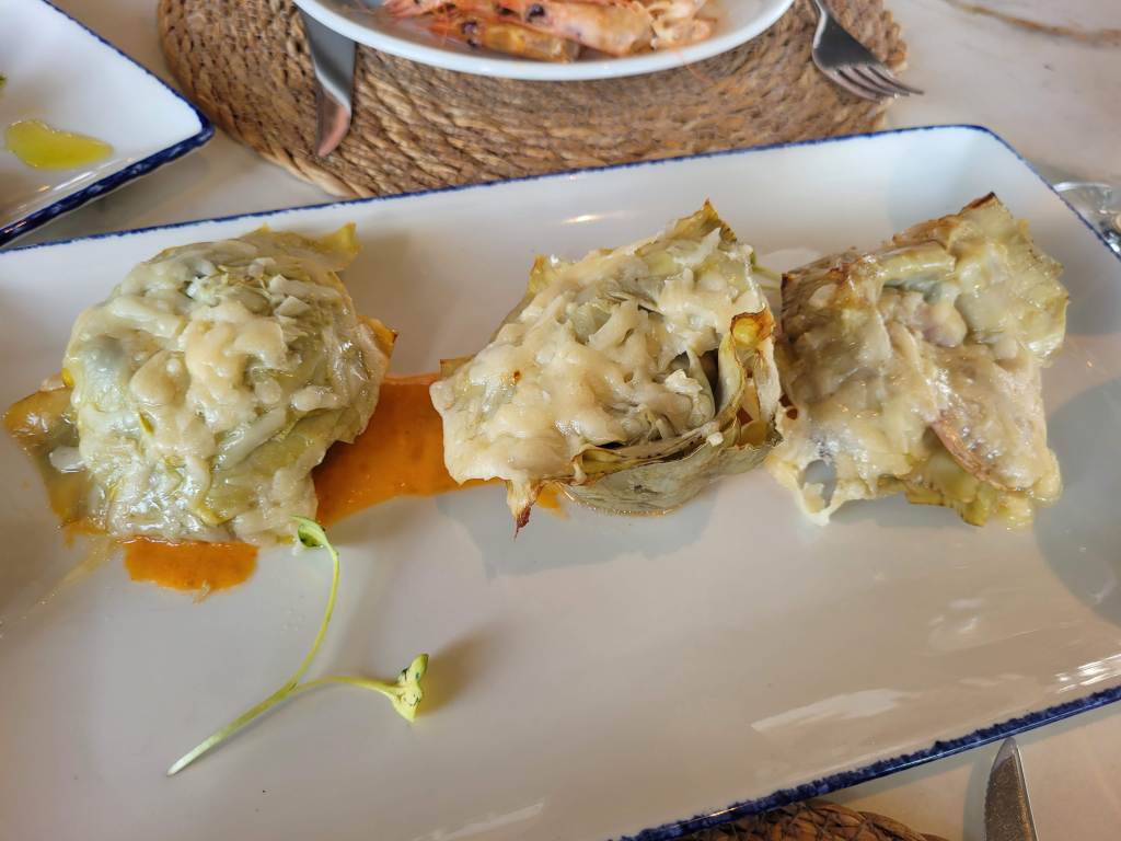 La tercera ración, unas alcachofas gratinadas, también llegó templada (poco después de las volandeiras) y además, estaban poco hechas (algo duras)