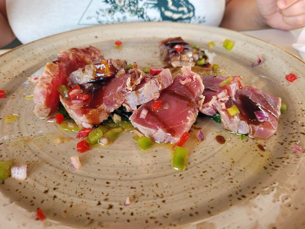 — Los primeros platos, mi mujer, tataki de atún rojo (que no era rojo) y taco de bacalao con parmentier de patata y pimientos asados.