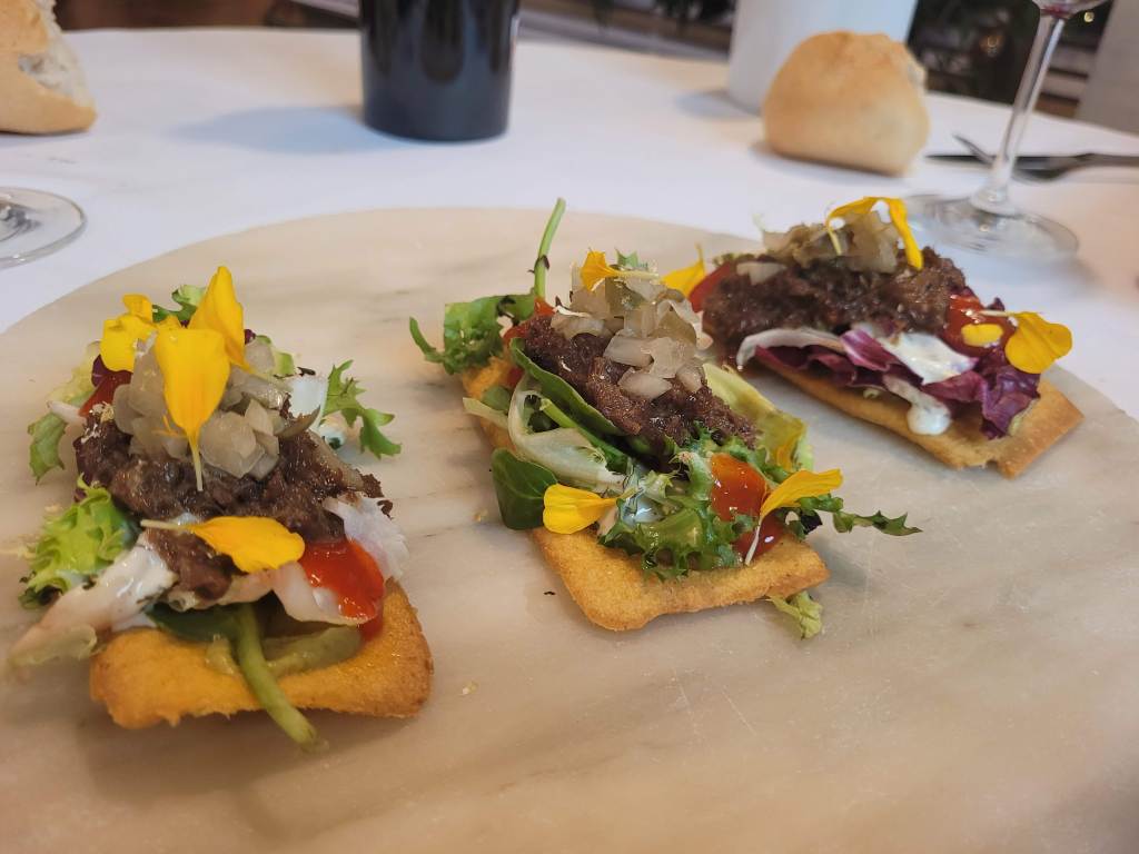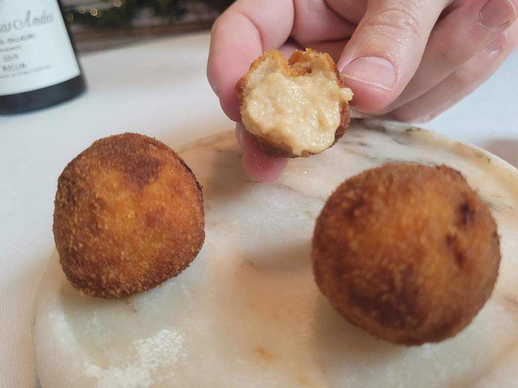 * Torto con carrilleras vegetales y encurtidos, crujiente, fresco y picante.