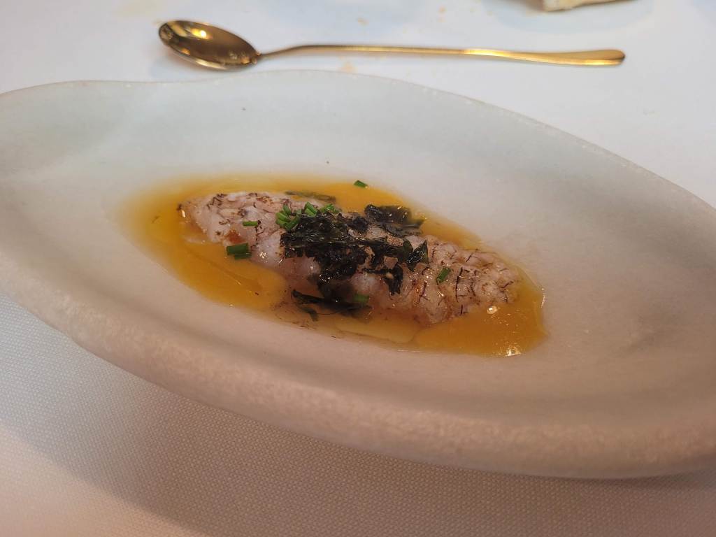* Galera tostada, en escabeche y algas, muy fresco con mucho sabor.