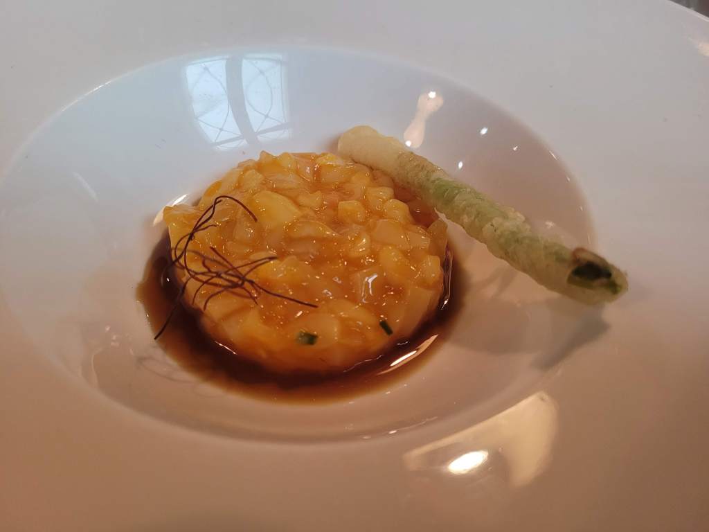 * Tartar de vieiras y esparrago en tempura, espectacular.