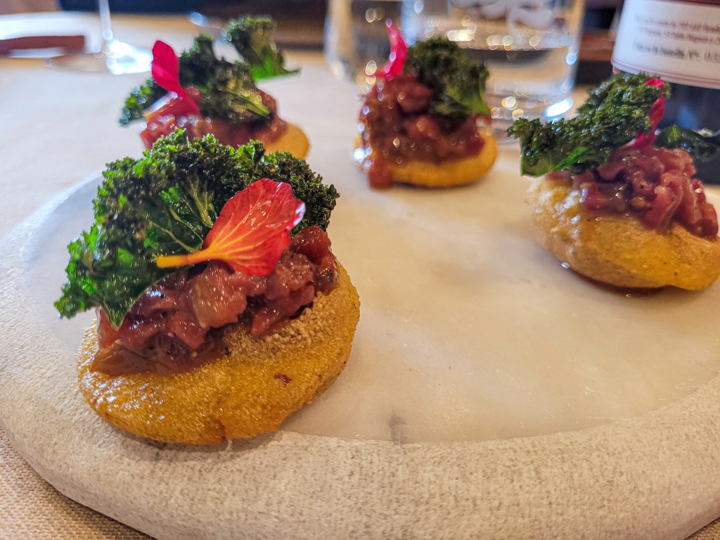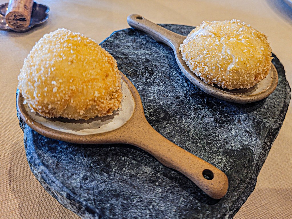 Arrancamos con una croqueta de jamón que ya apuntaba maneras: crujiente por fuera, cremosa por dentro, servida sobre una cuchara de cerámica rústica, muy fotogénica, todo hay que decirlo. Después vinieron estos maravillosos buñuelos rellenos de un queso también maravilloso, el 3 leches de Pría —un bocadito fantástico, intenso pero suave, de esos que no sabes si te acabas uno o cinco. Y cerramos el trío de entrantes con un torto de tartar de ternera asturiana y kale crujiente. Mezclamos cocina tradicional con moderna, y ese toque del kale crujiente le iba fantástico al tartar, aportando textura y un punto verde que redondeaba el bocado.