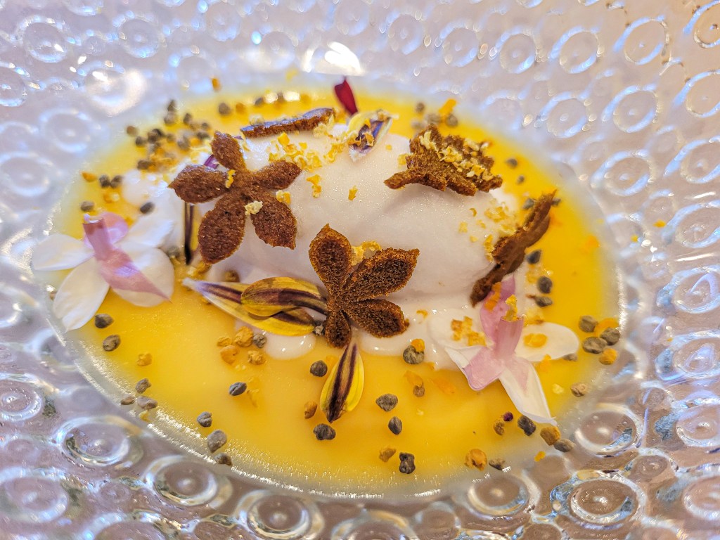 Aquí empieza el dulce. Cremoso de textura suave y sabor delicado, como si la hoja de naranjo fuese una esencia fresca que se cuela sin empalagar. Muy sutil, muy aromático. De esos postres que limpian el paladar sin pasarse.