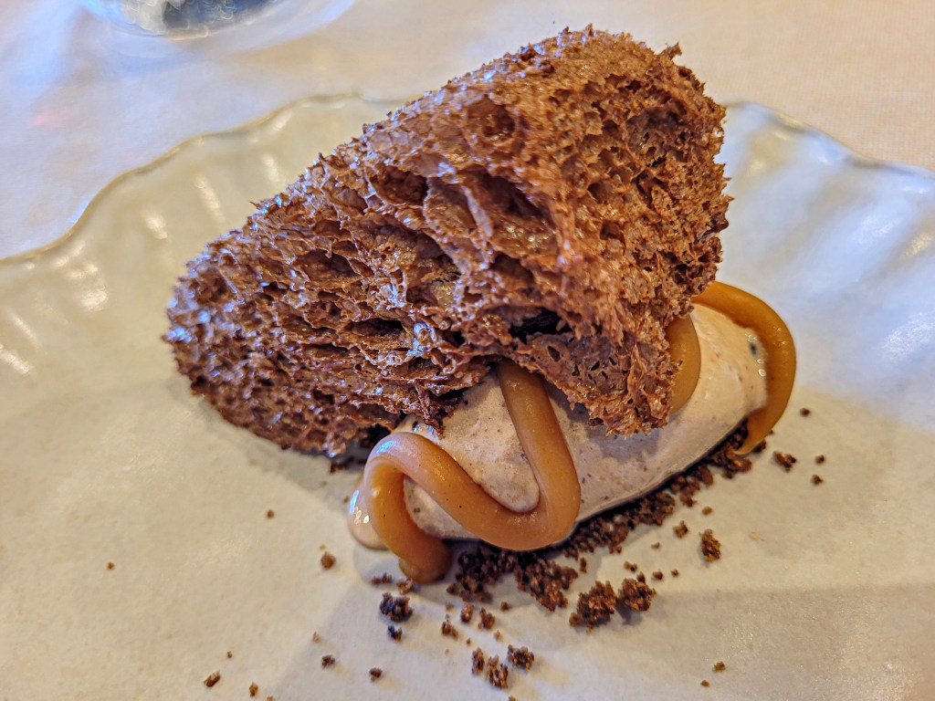 Y para cerrar, lo que parece una esponja de baño pero que sabe a gloria. Chocolate aireado hasta lo imposible, con un helado de avellana cremosísimo y unos churretes de tofe que rompían la dulzura con un puntito tostado y adictivo. El final perfecto.