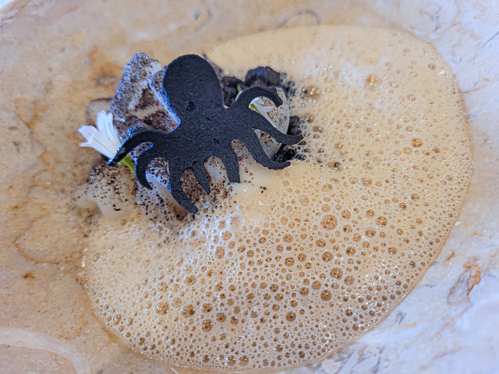 Este fue de los más impactantes visualmente. Una espuma densa, casi como una ola en movimiento, con un pulpo en silueta negra coronando el plato. El calamar estaba tierno, casi mantequilla, y esa mezcla de levadura y cebolla aportaba un rollo ahumado y meloso a la vez. Muy original y sorprendente.