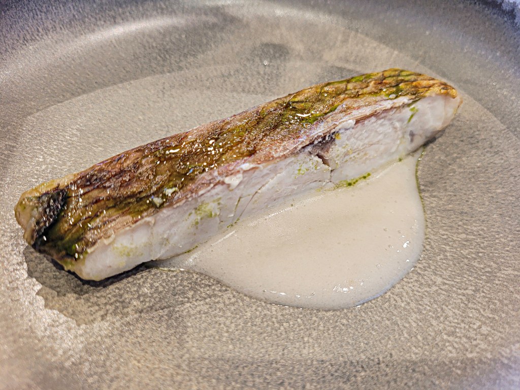 Aquí nos llegó un lomo de pescado (rubiel, creo), con la piel marcada y una salsa que parecía ligera pero que tenía mucha profundidad. Muy limpio, muy fino, de esos platos que respetan el producto y no lo disfrazan.