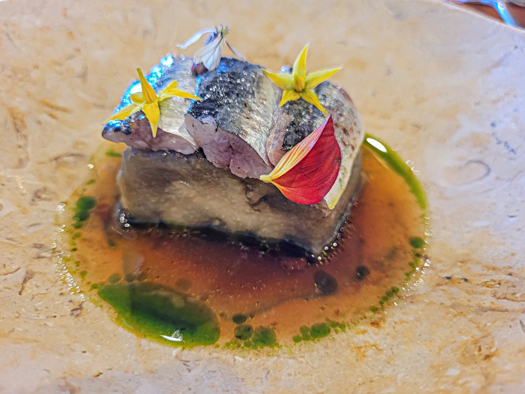 Este me encantó por lo inesperado. La sardina estaba curada, encima de una berenjena con textura de mousse, y ese jugo con aceite verde que rodeaba el plato era una bomba umami. Las flores encima parecían decoración, pero también sabían.