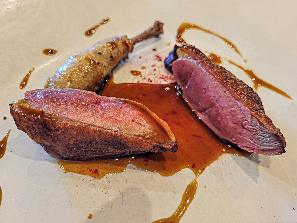 El plato más potente. Carne roja, jugosa, con esa piel crujiente que te hace feliz. Lo sirvieron con su muslito aparte y una salsa oscura con carácter. Un platazo para los carnívoros del grupo.