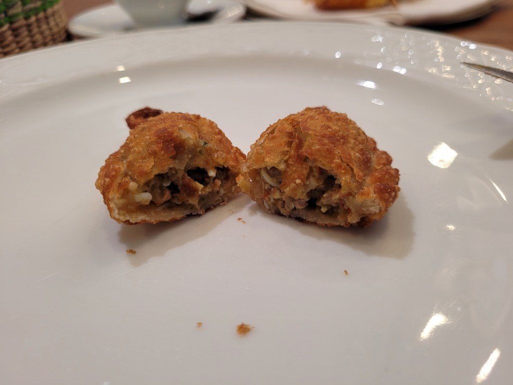 Una especie de empanadilla con queso en su interior, acompañada de vinagreta de tomate y aceite de albahaca. Un plato curioso, diferente, que funciona mejor de lo que parece sobre el papel.