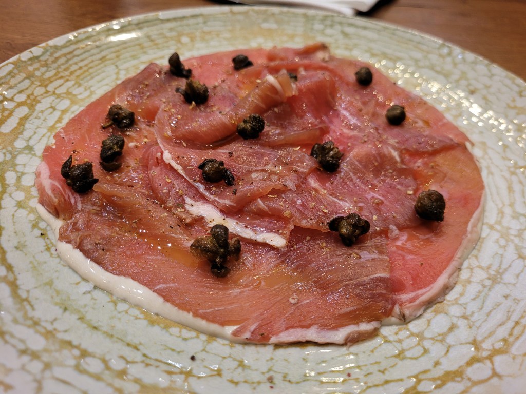Algo aguado, probablemente por una congelación o descongelación poco fina. Y en un carpaccio eso no perdona, porque la textura es medio plato.