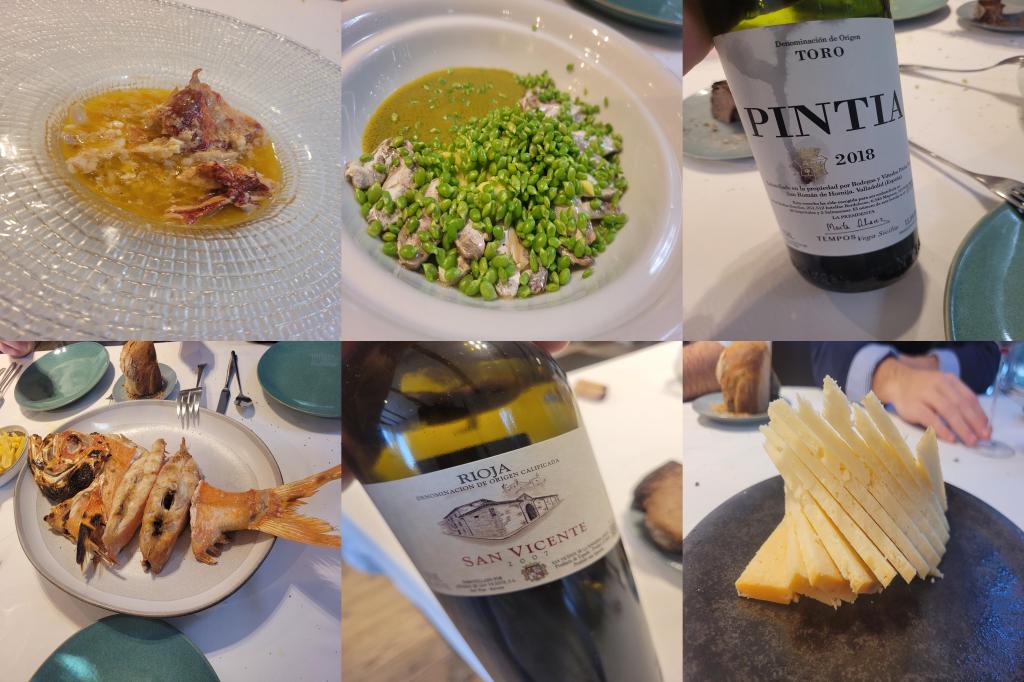 Los pimientos del piquillo a la brasa funcionan, bien ejecutados, con bonito de sus conservas. El salpicón de bogavante es uno de los mejores pases, equilibrado y bien medido. Los guisantes con cococha muestran técnica, buen pil-pil y producto. En estos platos se intuye el restaurante que podría ser si decidiera abrirse un poco más al comensal.