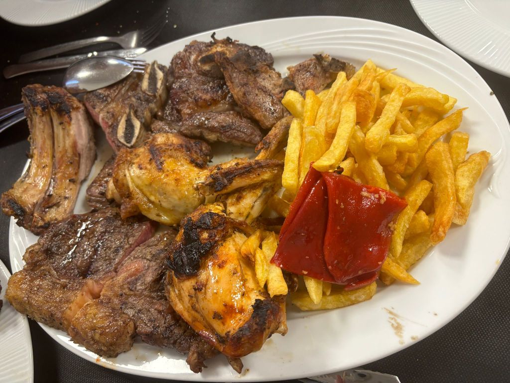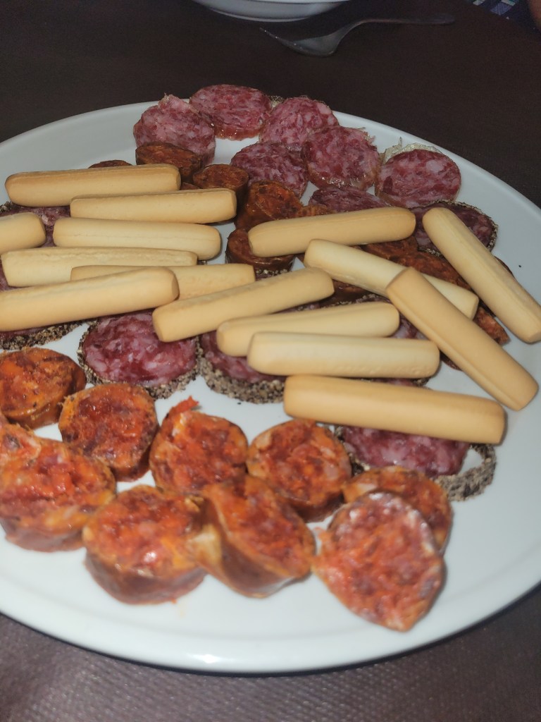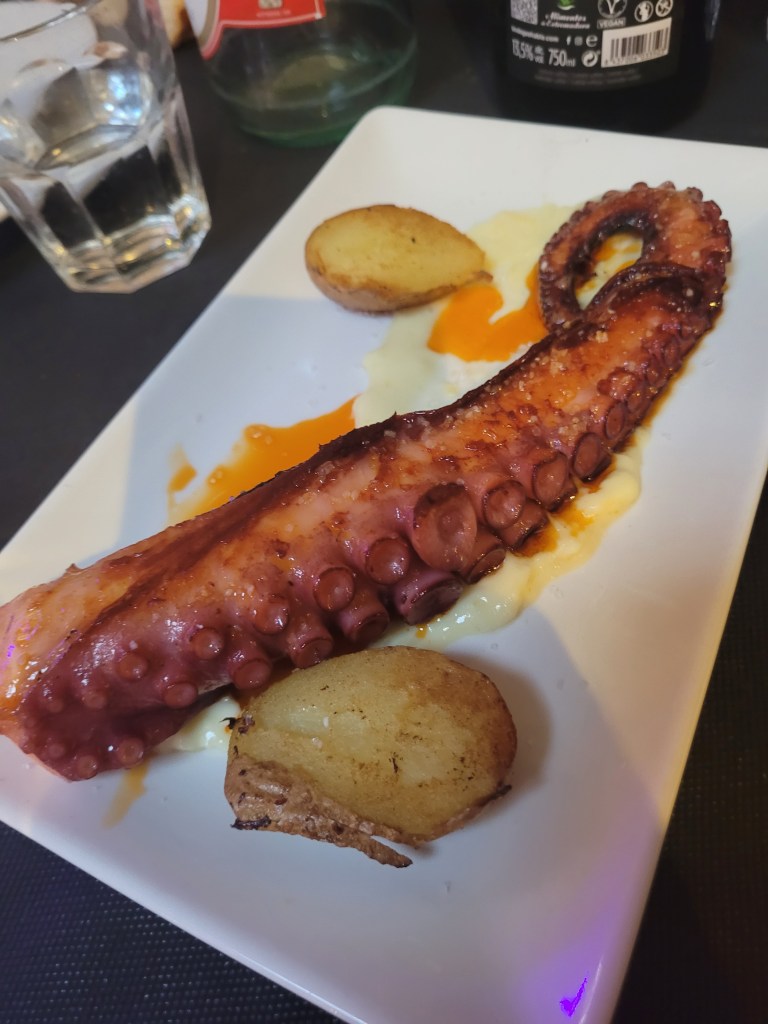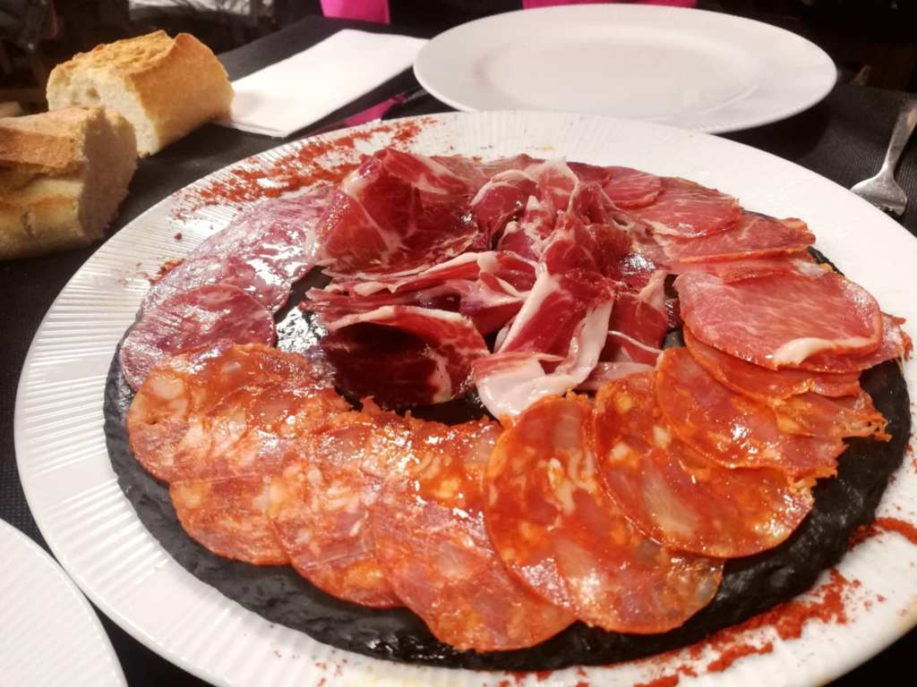 En los entrantes elegidos, la cecina de vaca resultó ser un producto de gran calidad, con un sabor intenso y bien curado. No ocurrió lo mismo con la paleta ibérica, cuyo carácter se quedó corto; lejos de lo que se espera de un ibérico auténtico, daba la sensación de necesitar un 50 % más de identidad.