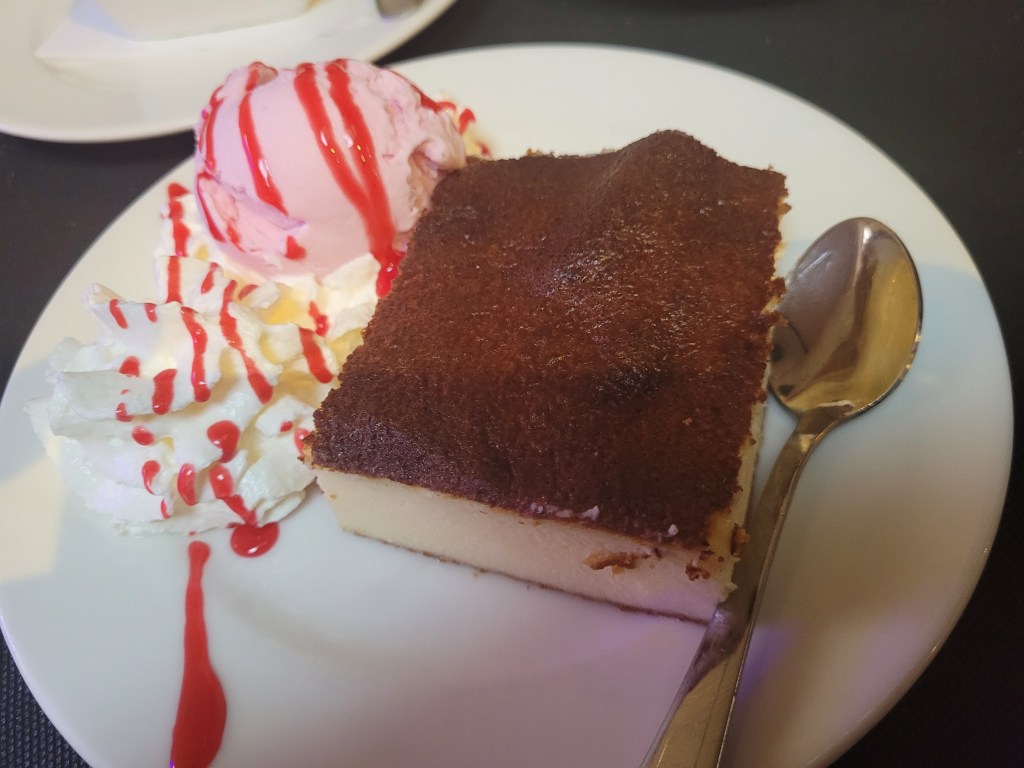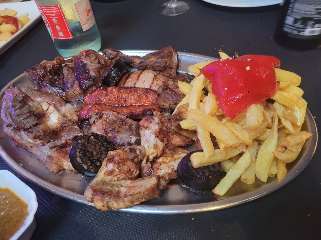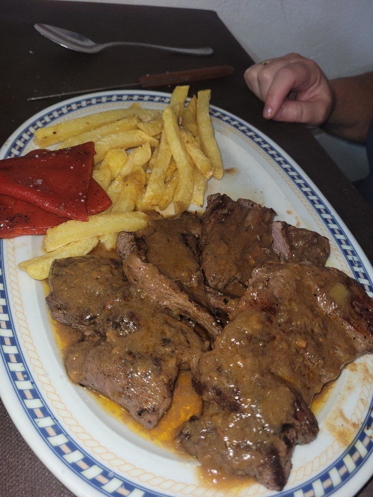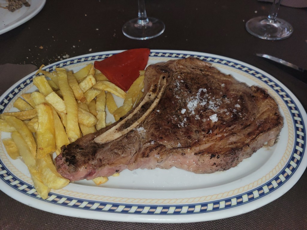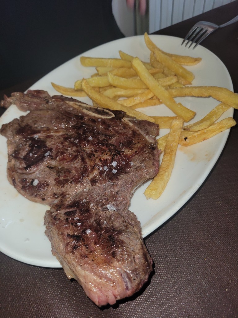 Pero el mayor motivo de mi visita era el plato principal. En carta se anunciaba una Chuleta de Buey madurada 150 días, pero, al llegar, nos informaron de que no estaba disponible. Como alternativa, se ofrecía un chuletón de Wagyu de su propia ganadería, con 20 días de maduración. El resultado fue decepcionante: un sabor sorprendentemente suave, con una infiltración de grasa excesiva y poco aprovechable, hasta el punto de recordar más a una ternera que a un wagyu bien trabajado. A 70 euros el kilo, la expectativa era considerablemente mayor.